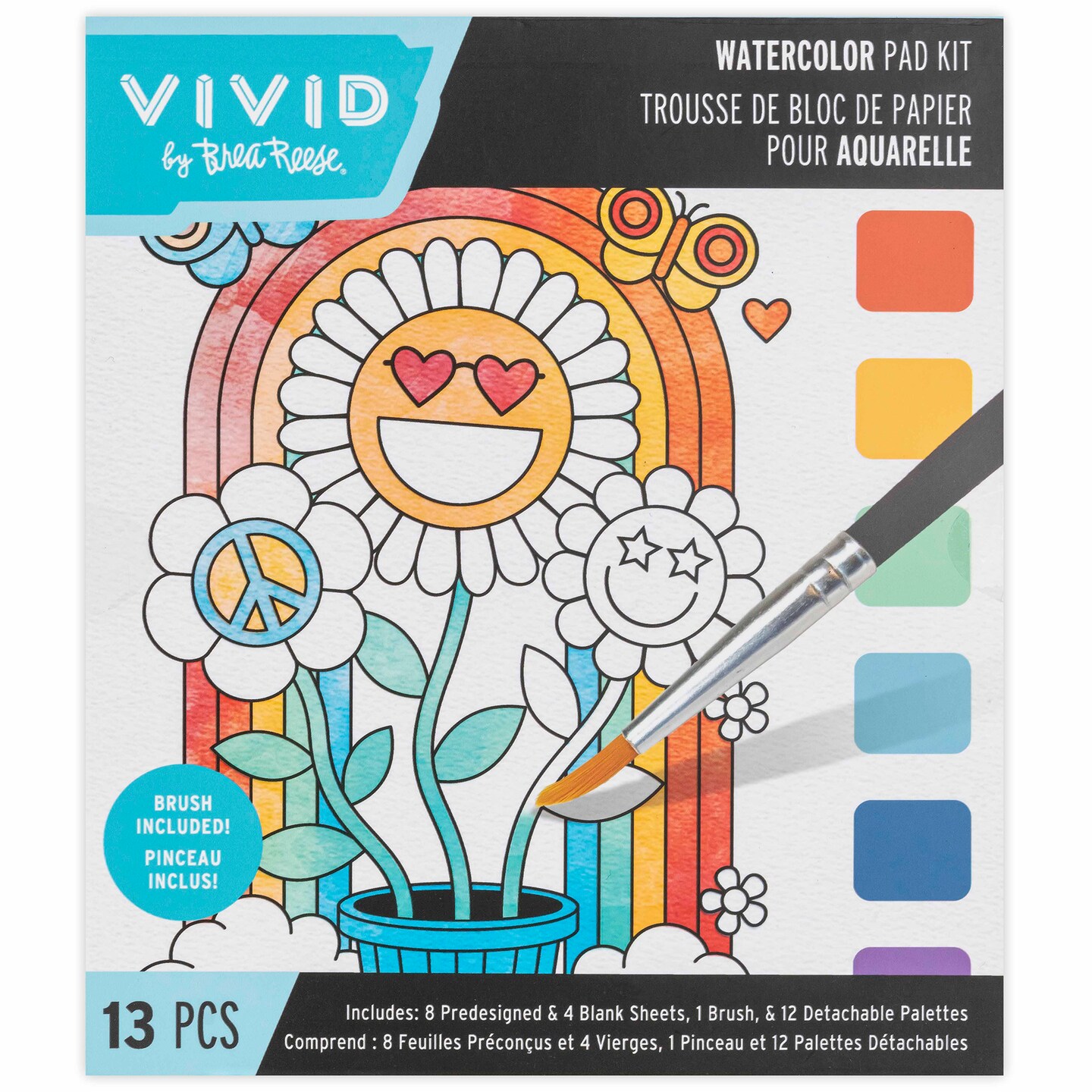 Vivid by Brea Reese: Watercolor Pad Kit - Rainbow - 8 Retro Groovy Themed Designs & 4 Blank Sheets, 12 Detachable Paint Palettes, Brush, Art Activity