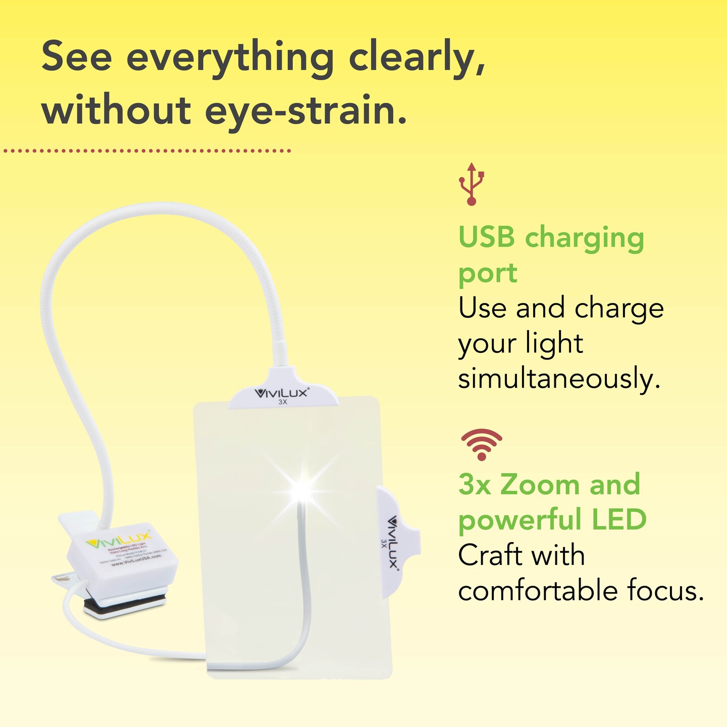 ViviLux Optical Grade 3X Magnifier with Light, 1200 Lumen, Rechargeable LED Craft Light, Wide Mouth Clip, Hands-Free for Sewing & Needlework