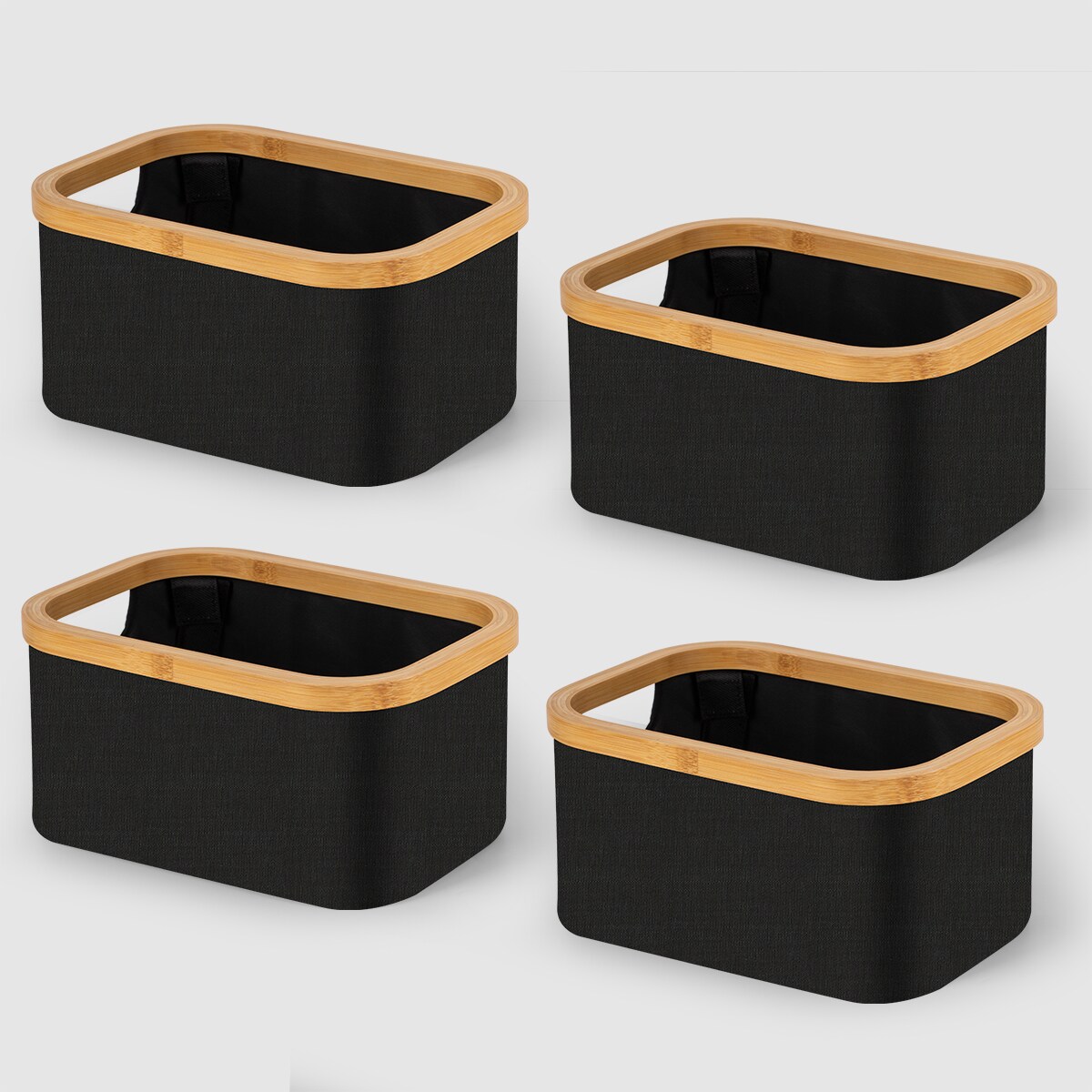 VUSIGN Bamboo Wood Frame Storage Small Black – Small Collapsible Fabric Storage Basket with Bamboo Handles, Black, for Home & Office Organization (4-Pack)