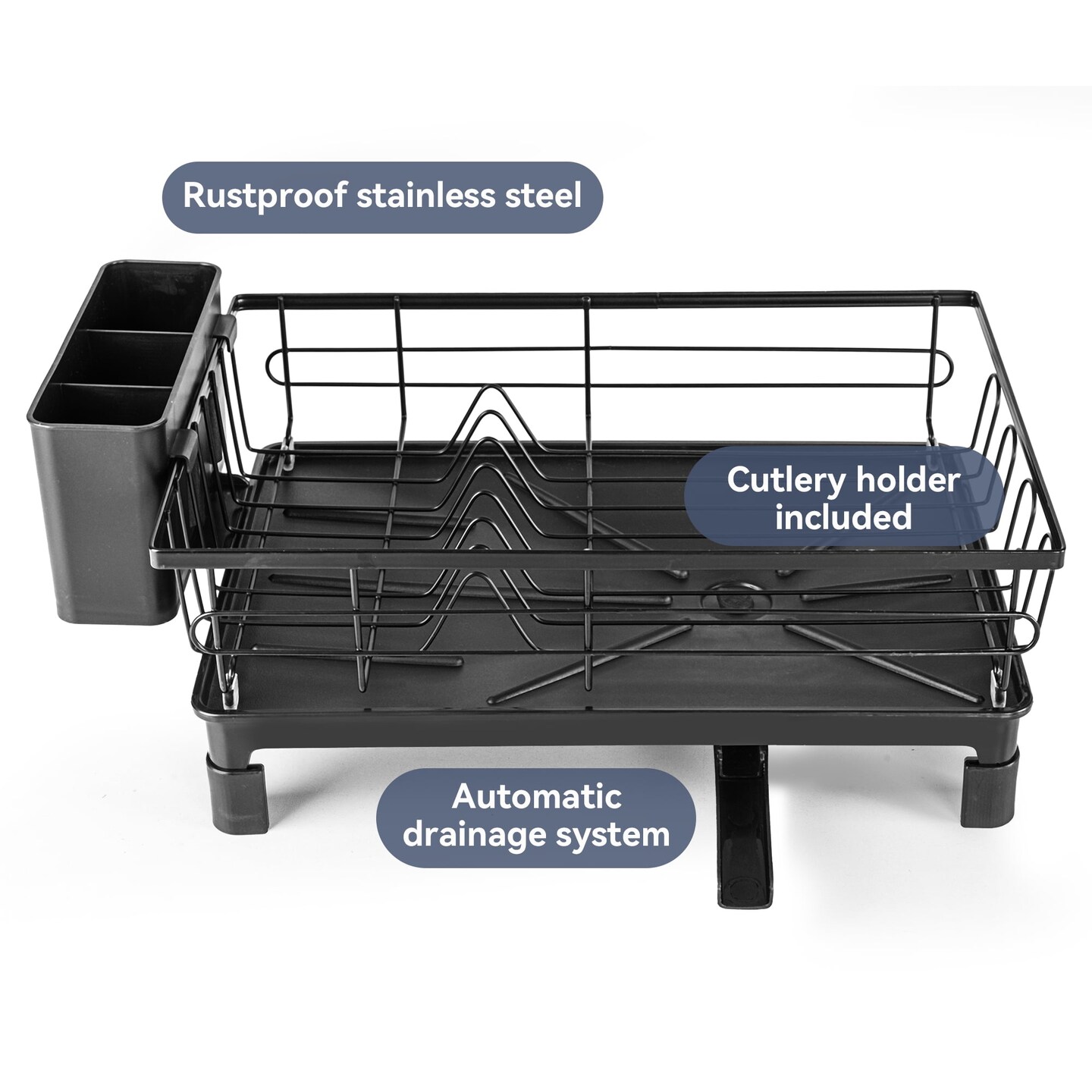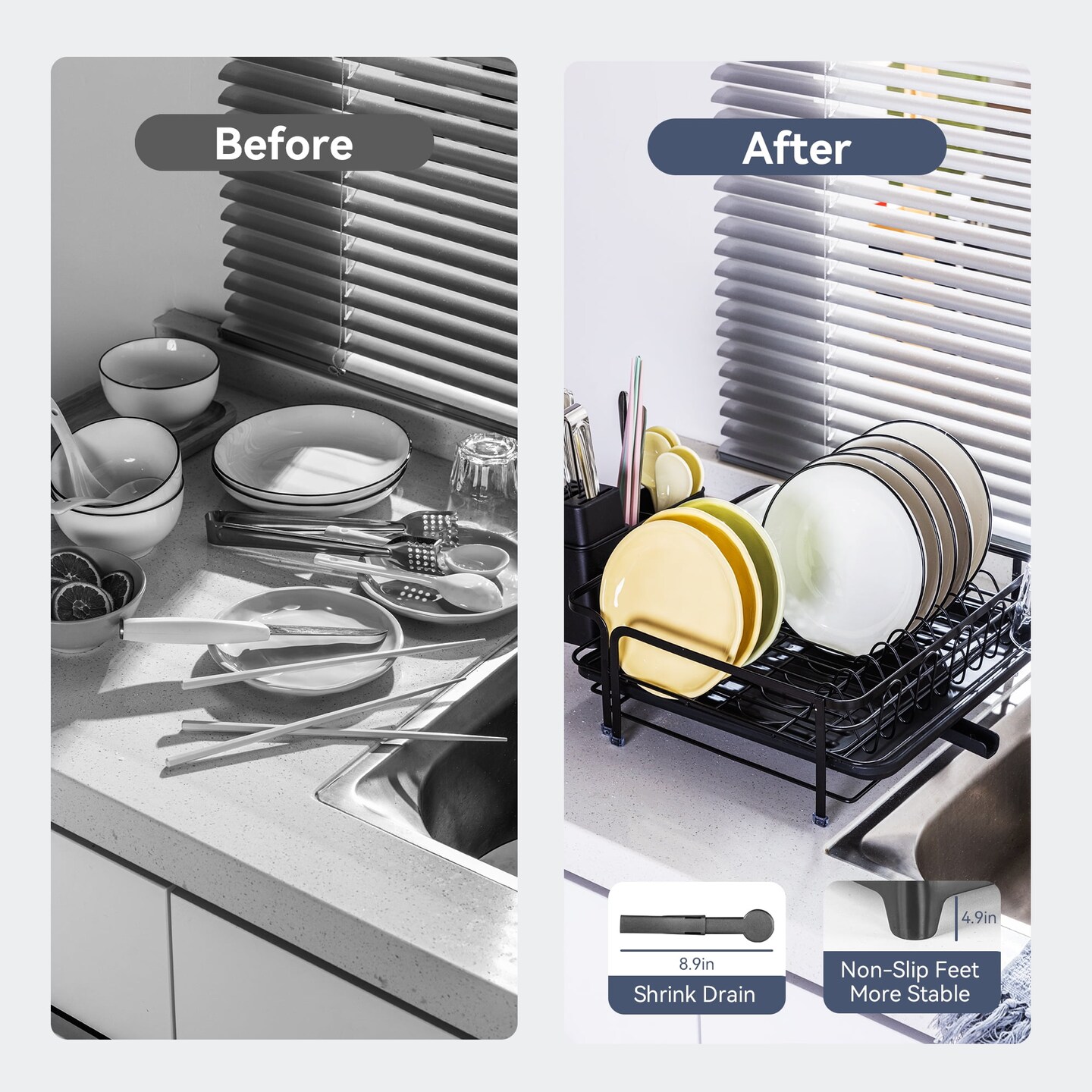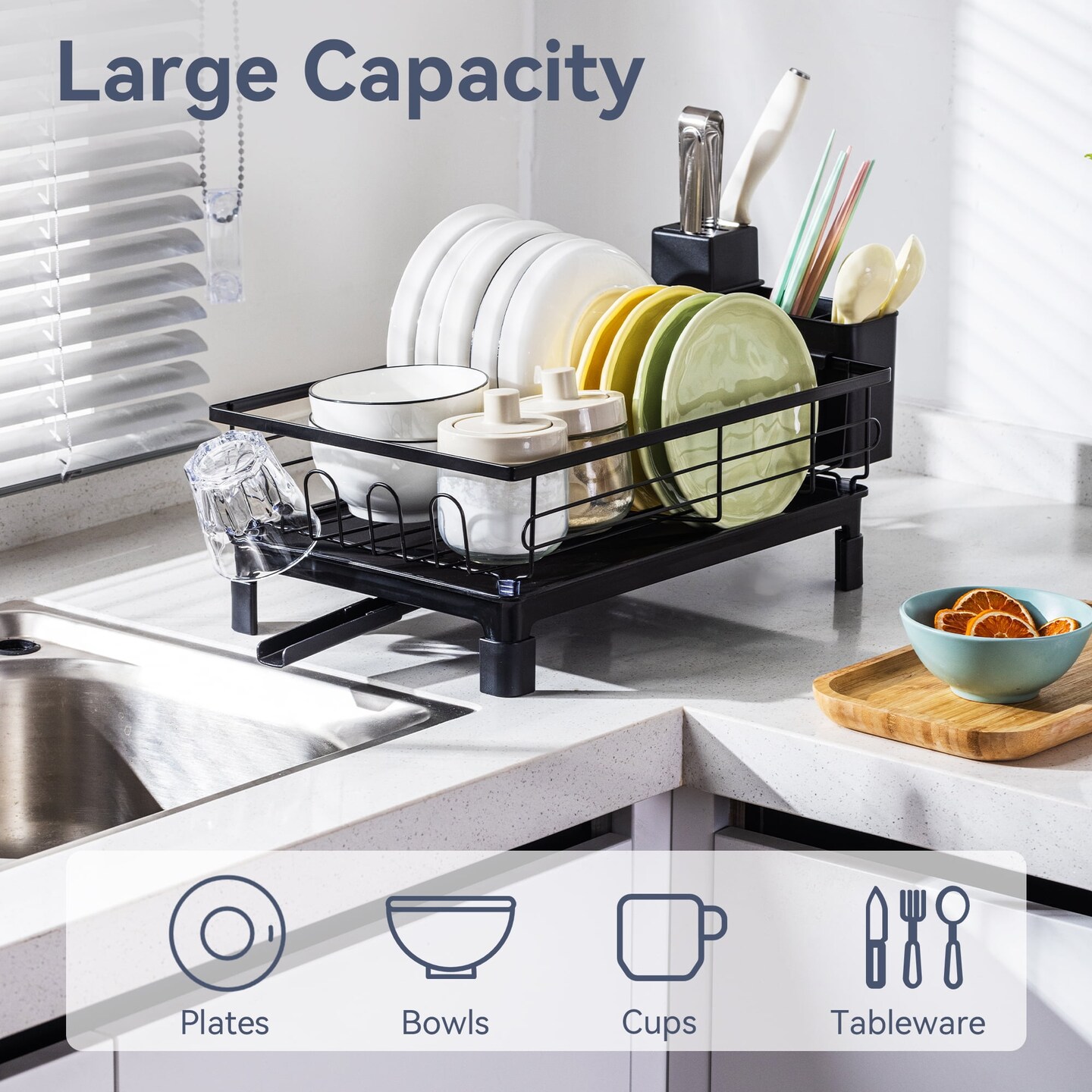 VUSIGN Dish Drying Rack - Space-Saving Dish Rack,Dish Racks for Kitchen Counter with Drainboard, Rustproof Dish Drainer with a Removable 4-Compartment Utensil Holder,Black