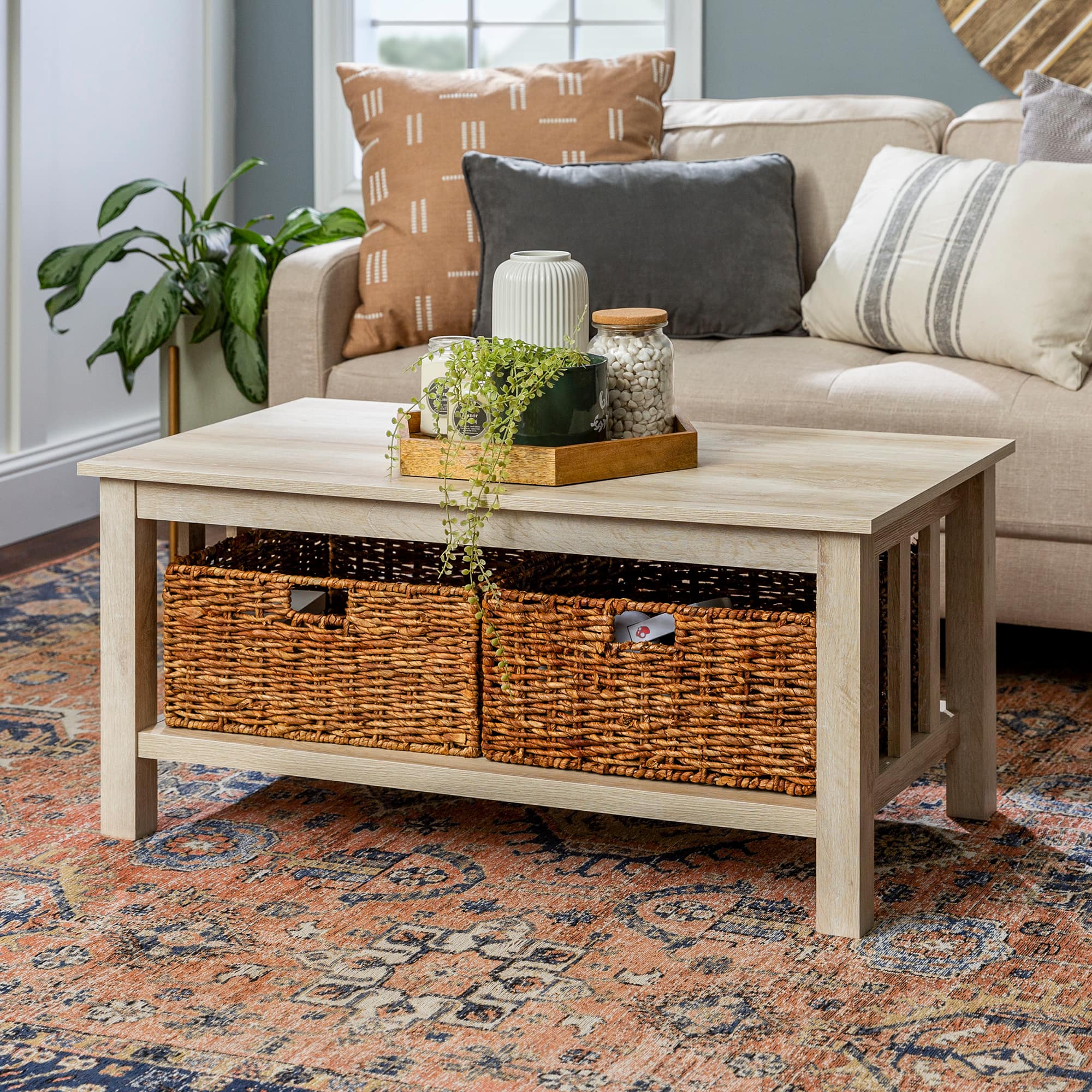 Walker Edison 40" White Oak Mission Storage Coffee Table with Baskets