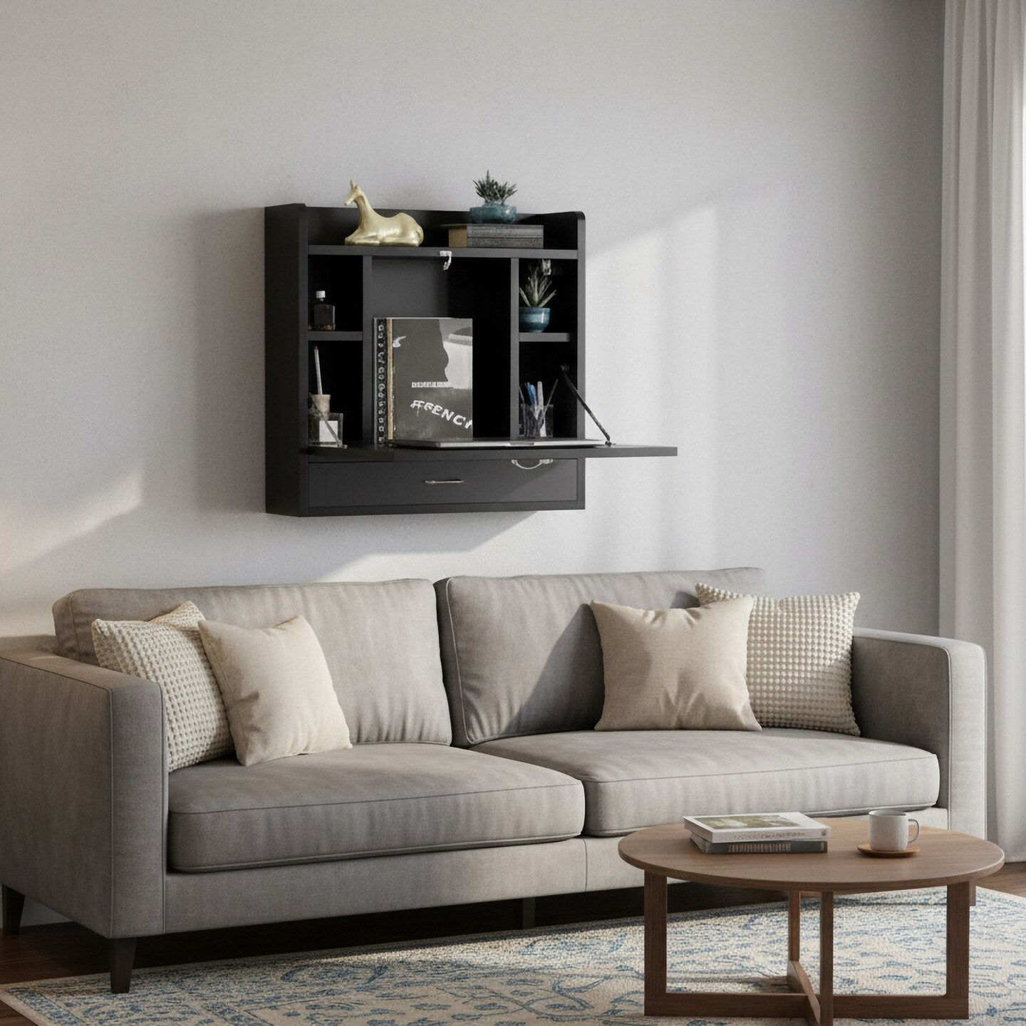 Wall Mount Folding Laptop Writing Computer or Makeup Desk with Storage Shelves and Drawer
