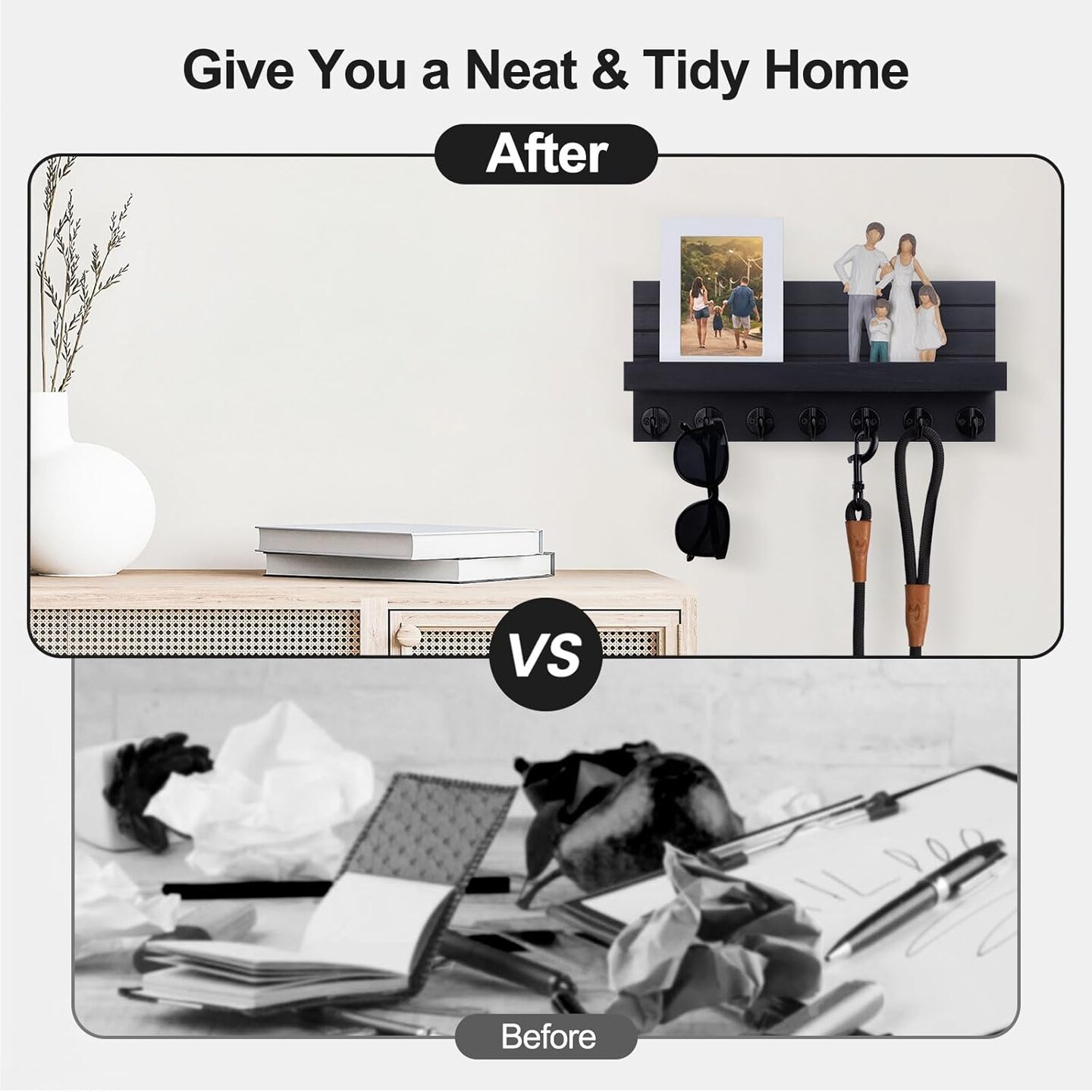 Wall-Mounted Key and Mail Holder with Shelf – Entryway Organizer with 7 Sturdy Hooks, Decorative Wood Wall Shelf for Sunglasses, Dog Leashes & Home Décor (Black)