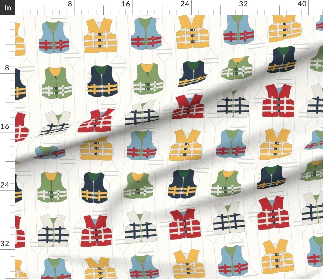 Water Sports Boating Life Jacket Vest Americana Lake House Cabincore Vacation Nautical Coastal Ocean Beach Colorful Traditional Red Blue Yellow Custom Printed Fabric by Spoonflower Various Fabrics by the Yard or Fat Quarter