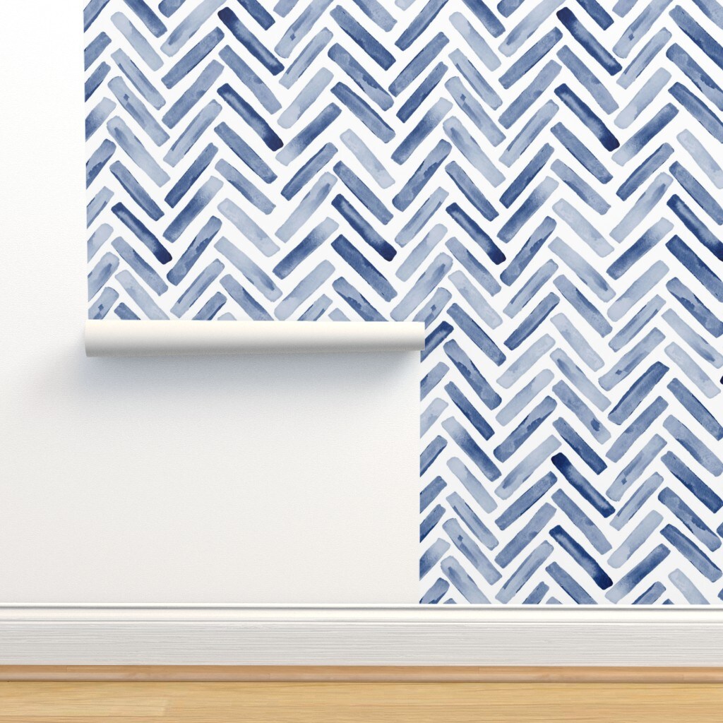 Watercolor Chevron Herringbone Modern Boy Nursery Blue And White Custom Removable Wallpaper by Spoonflower Peel & Stick Wallpaper 2FT Wide