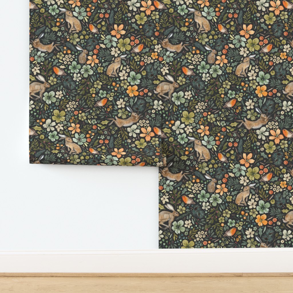 Watercolor Cottagecore Autumn Winter Hand Drawn Robin Orange Holly Leaves Floral Christmas Rabbit Hare Farmhouse Woodland Creatures Flowers Custom Removable Wallpaper by Spoonflower Peel & Stick Wallpaper 2FT Wide