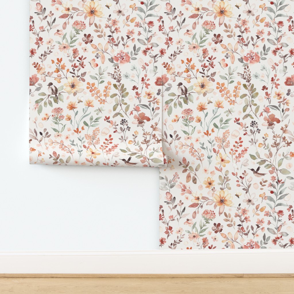 Watercolor Cottagecore Floral Wildflowers Hummingbird Bees Nature Botanical Meadow Butterfly Birds Garden Pink Flowers Boho Farmhouse Rustic Custom Removable Wallpaper by Spoonflower Peel & Stick Wallpaper 2FT Wide