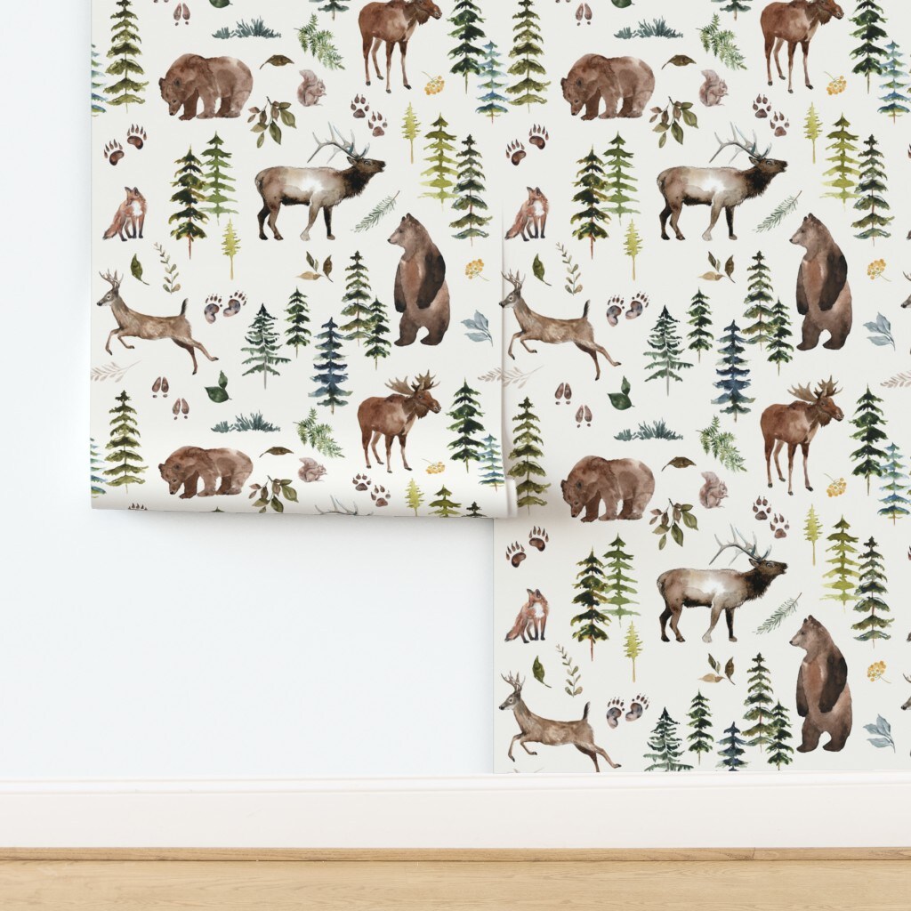 Watercolor Forest Green Trees Bear Elk Fox Deer Moose Gender Neutral Animals Custom Pre-pasted Wallpaper by Spoonflower Pre-Pasted Wallpaper 2FT Wide