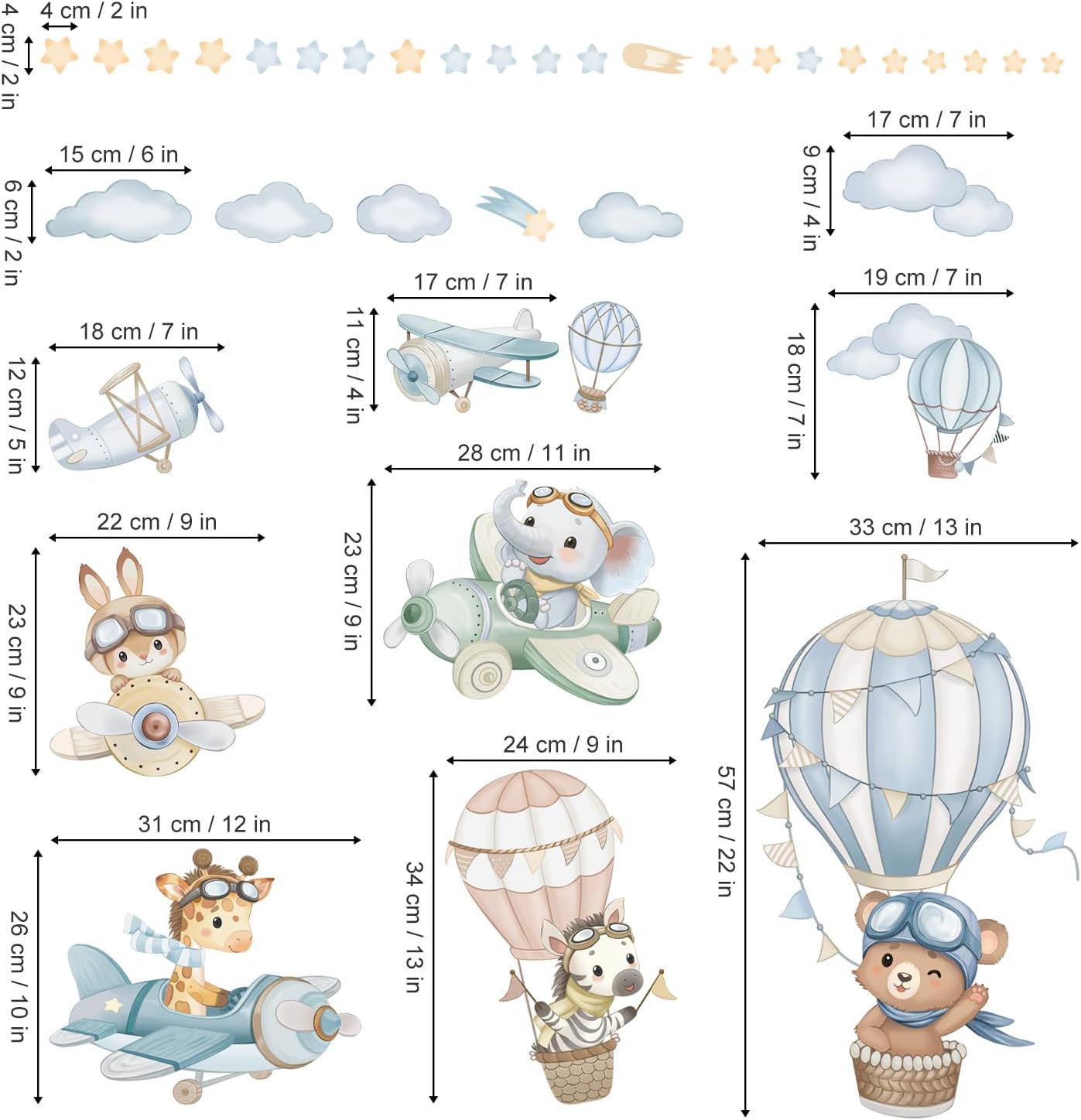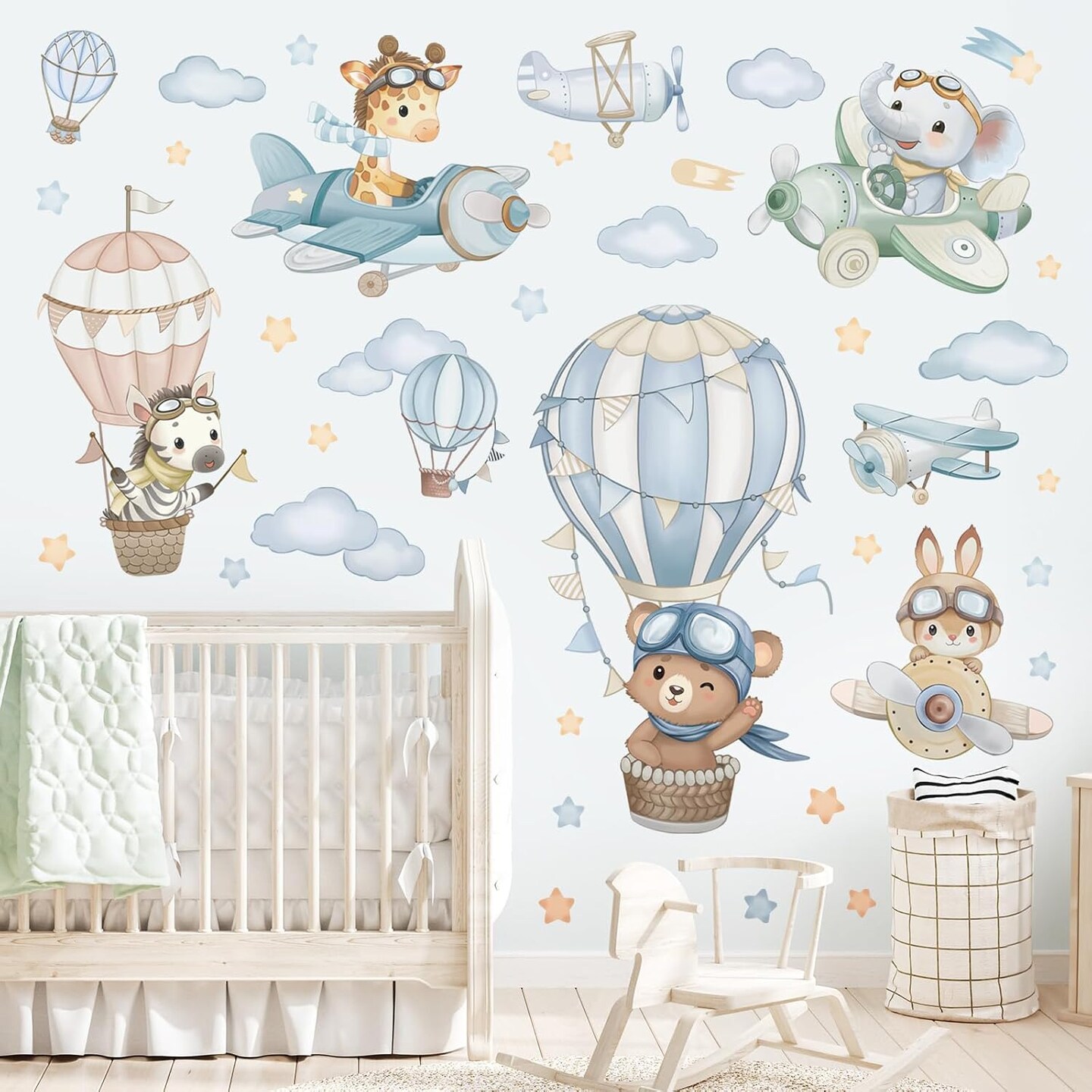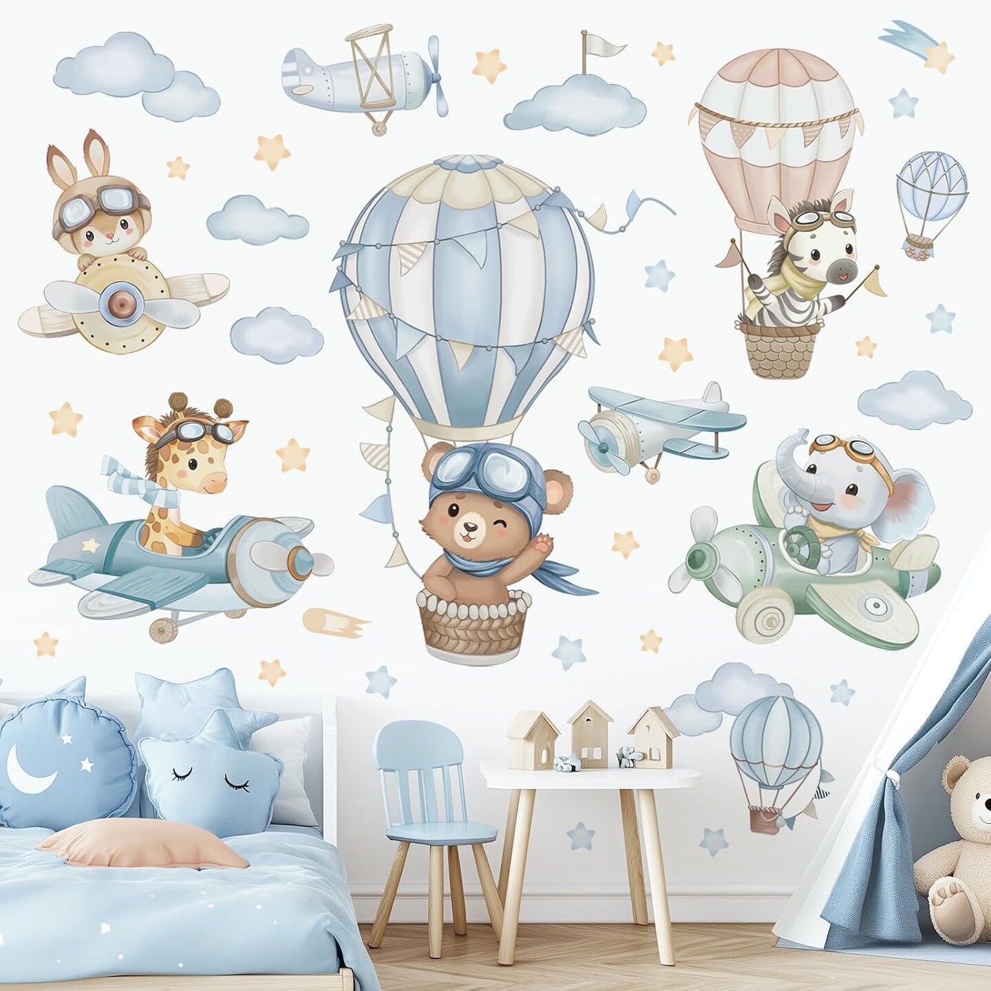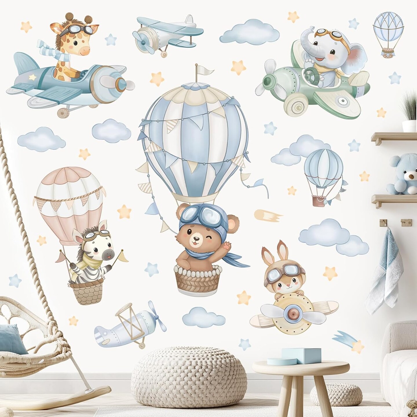Watercolor Hot Air Balloon Animals Wall Art Decals(Multi)