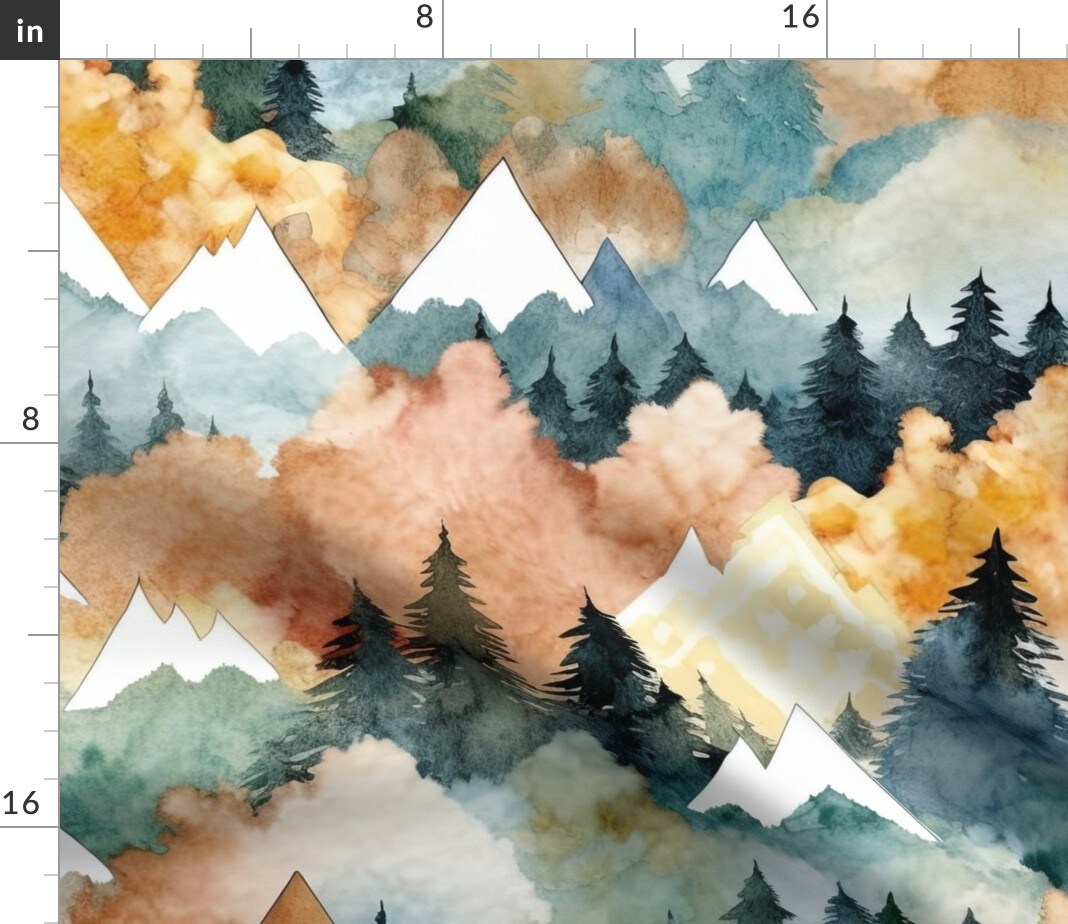 Watercolor Mountain Green Orange Woodland Pine Forest Adventure Custom Printed Fabric by Spoonflower Various Fabrics by the Yard or Fat Quarter 15047166