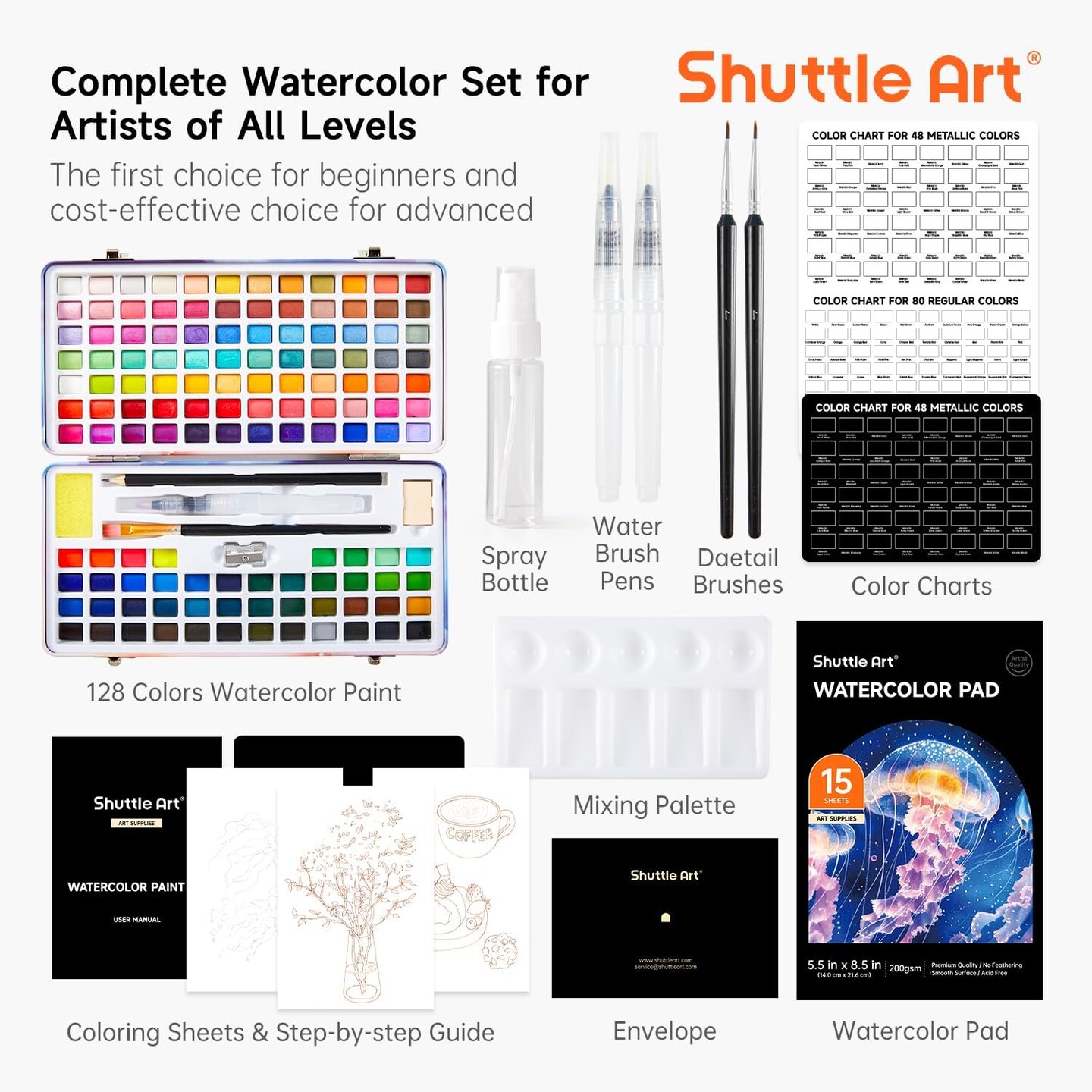 Watercolor Paint Set, 128 Vibrant Colors with Metallic Shades, Travel Water Color Set with Watercolor Brushes, Palette, Watercolor Sketchbook and Coloring Sheets