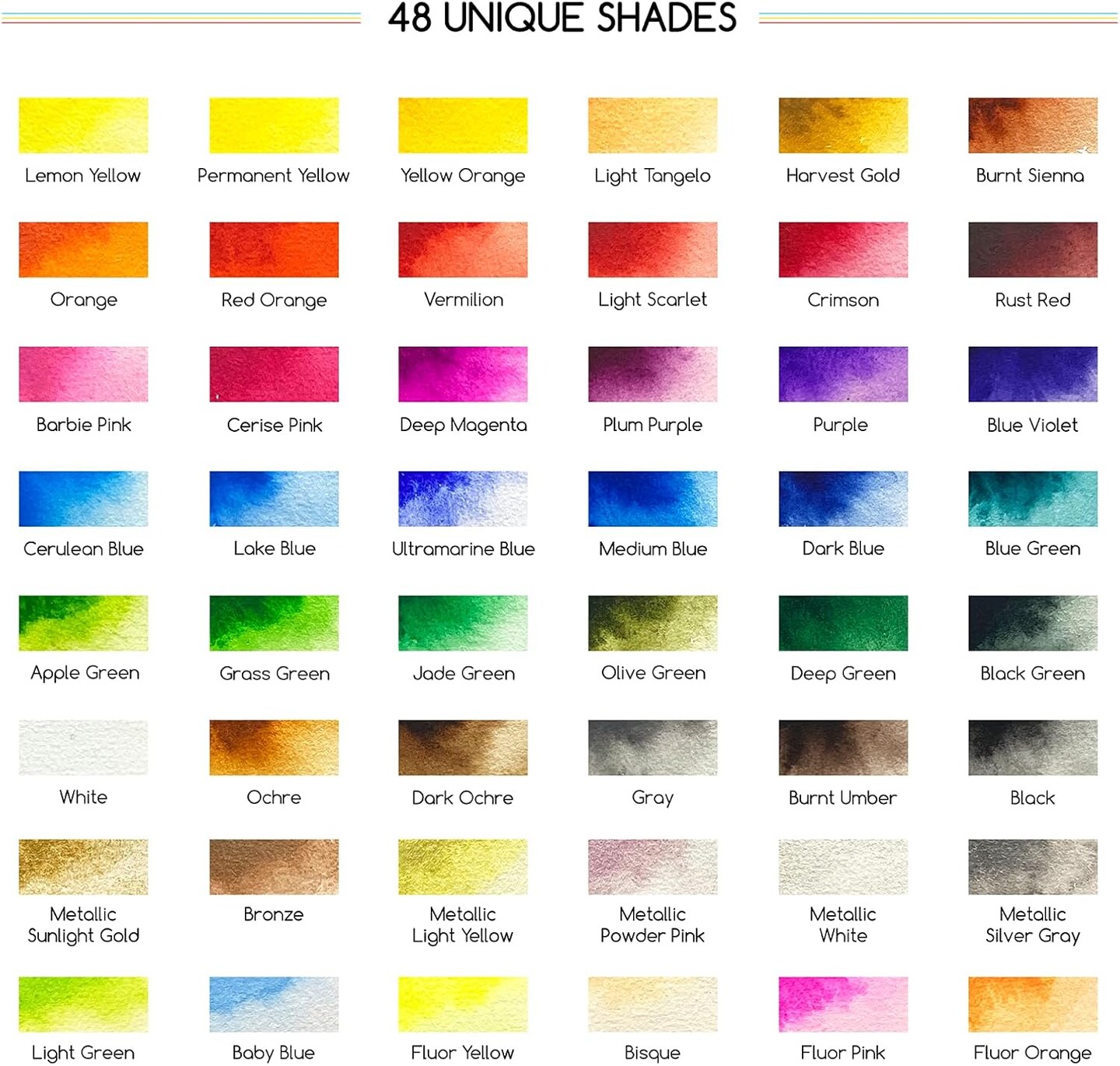 Watercolor Paint Set 48 Colors in Portable Box, Paint Kit with Brush, Palette, Art Supplies, Customizable Color Blocks, Bright Watercolors Travel Set for Adult Teens Beginner Amateur Artists