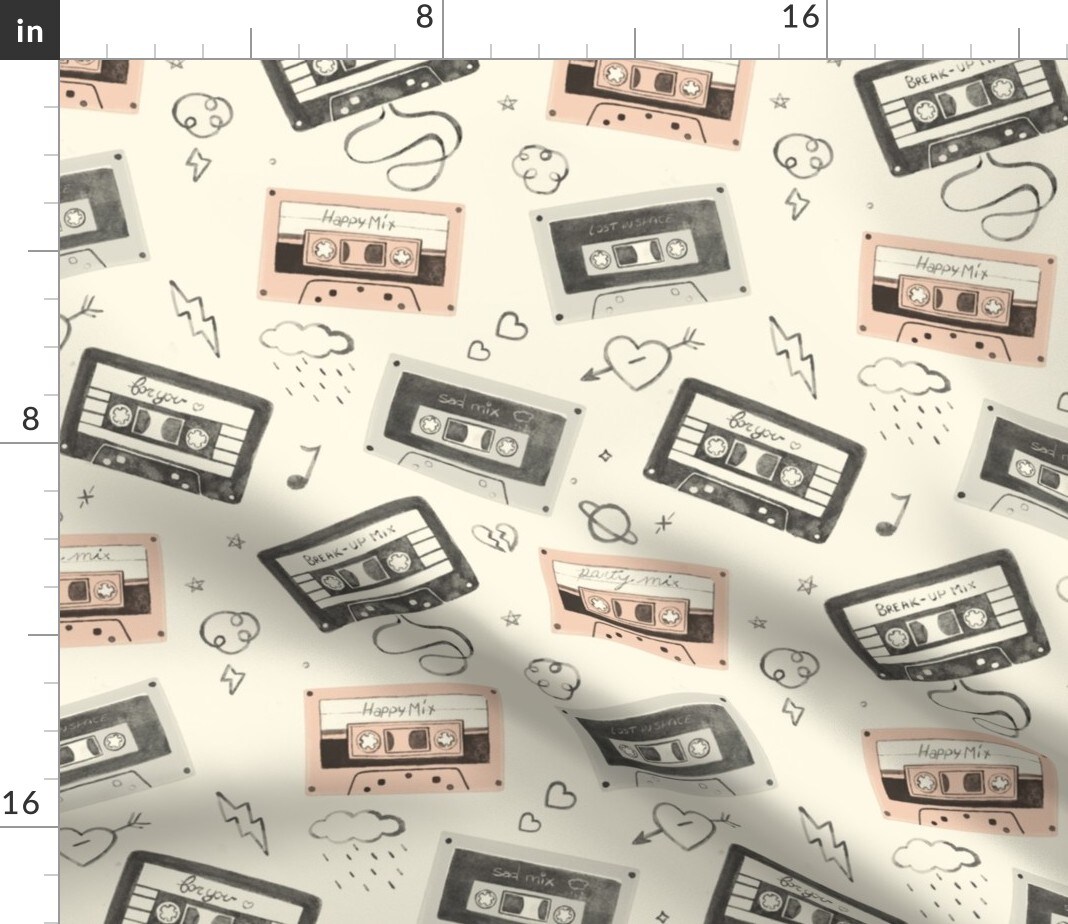 Watercolor Vintage Retro Cassette Tape 80S 90S Love Novelty Teenager Music Hand Drawn Handwriting Lightning Bolt Storm Cloud Rain Doodle Heart Custom Printed Fabric by Spoonflower Various Fabrics by the Yard or Fat Quarter