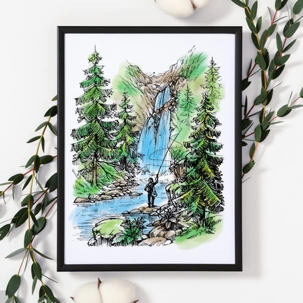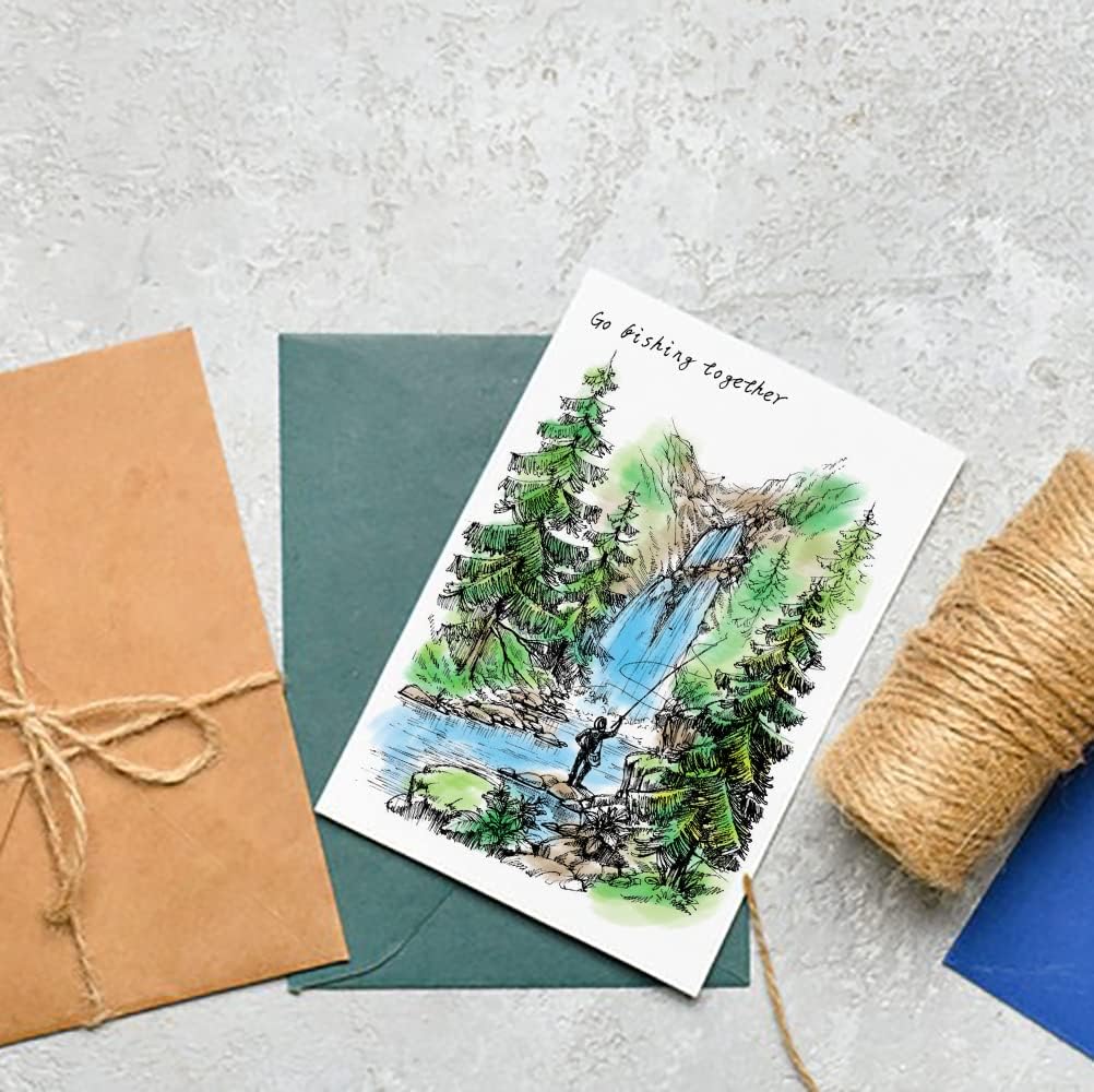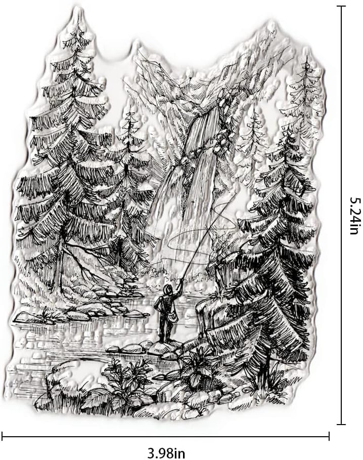 Waterfall Trees Background Clear Stamps for Card Making Journaling, Mountain Forest Silicone Stamps Fishing Man Rubber Stamps for Scrapbooking DIY Cards Album Crafts Supplies