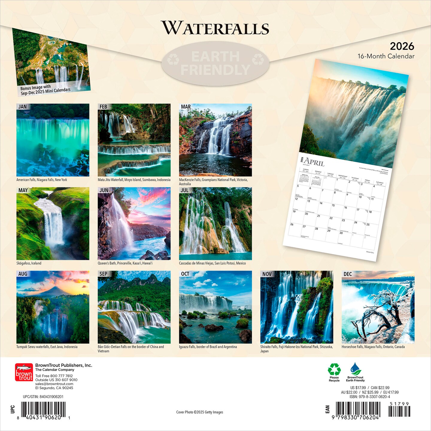 Waterfalls | 2026 12 x 24 Inch (Hanging) Monthly Square Wall Calendar | Plastic-Free
