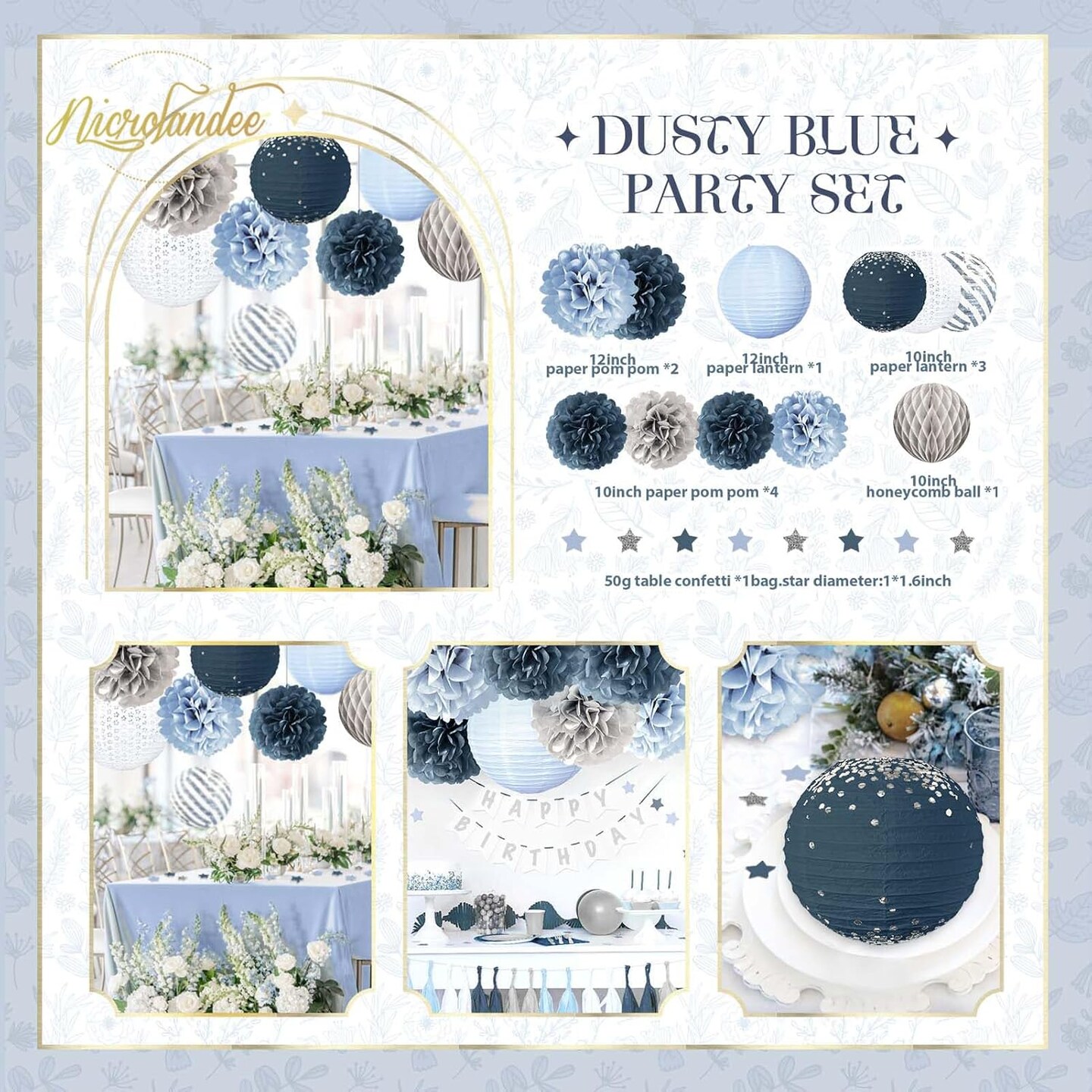 Wedding Party Decorations - 12PCS Dusty Blue Tissue Pom Poms Paper Lantern 50G Glitter Confetti Party Supplies for Romantic Wedding, Bridal Shower, Baby Shower, Birthday, Special Events