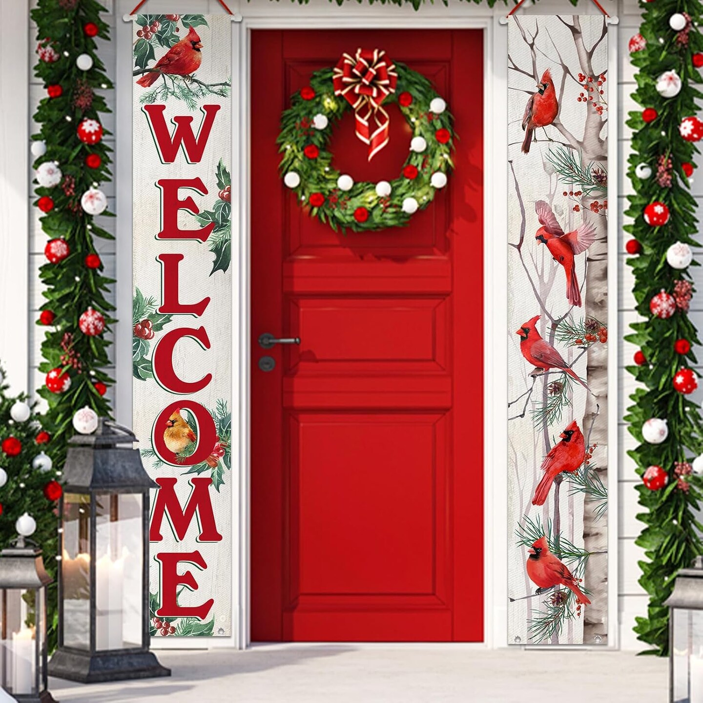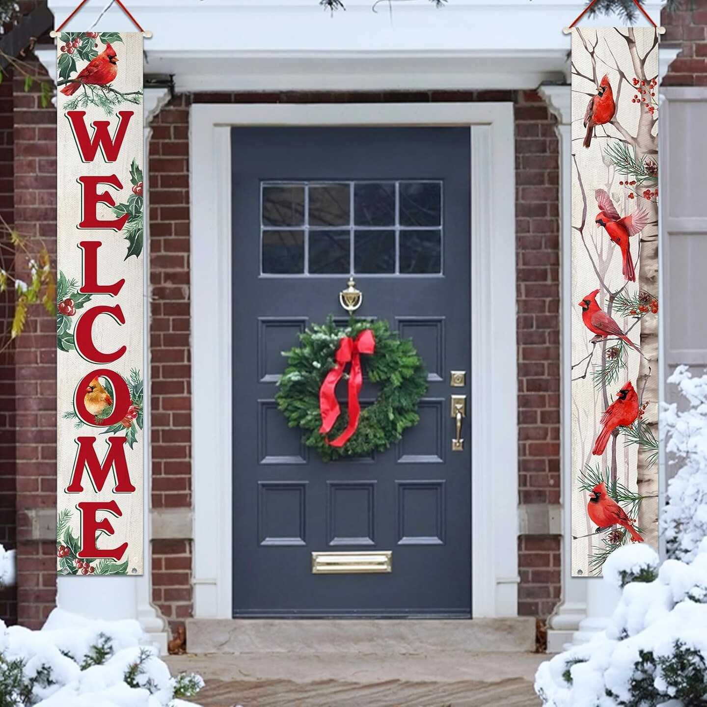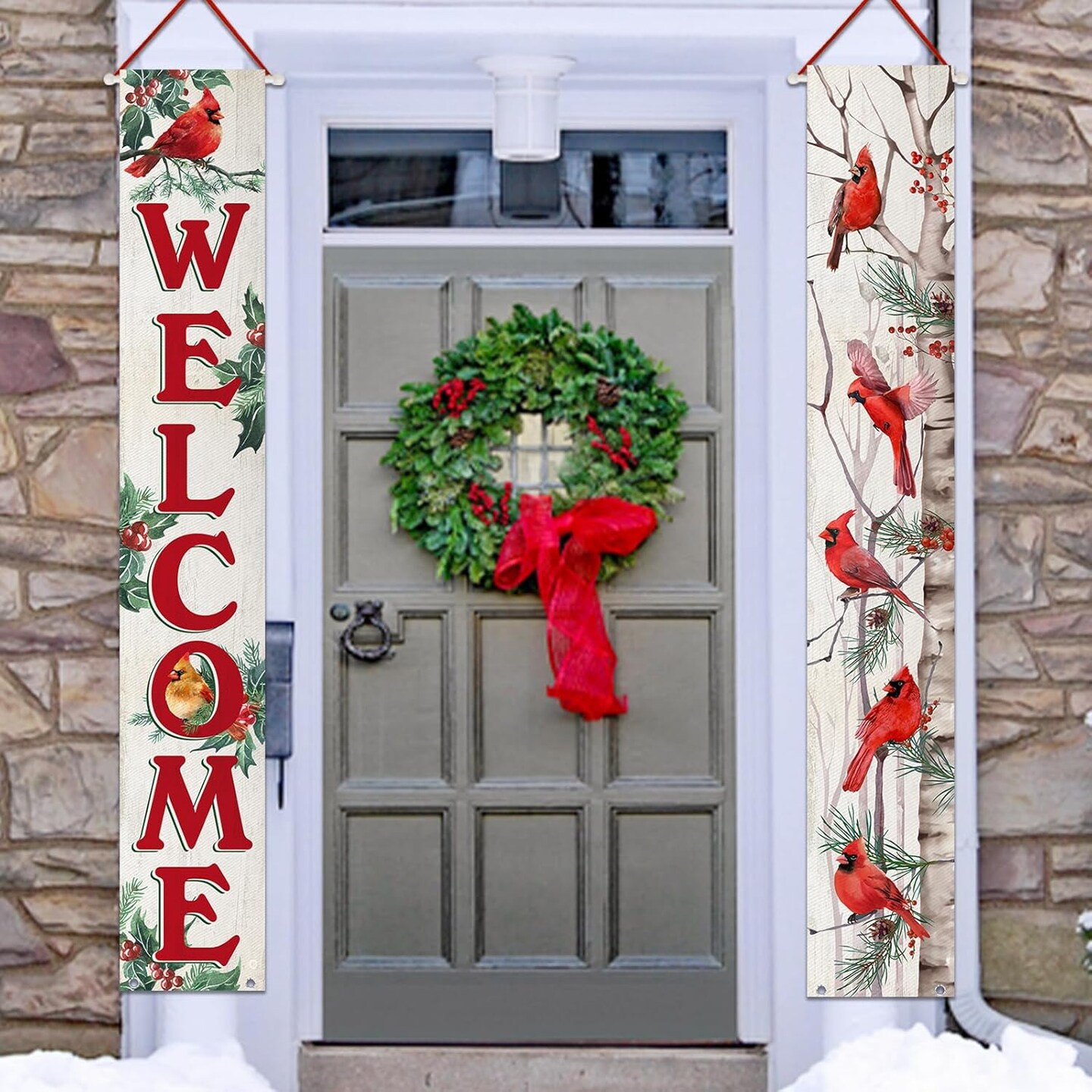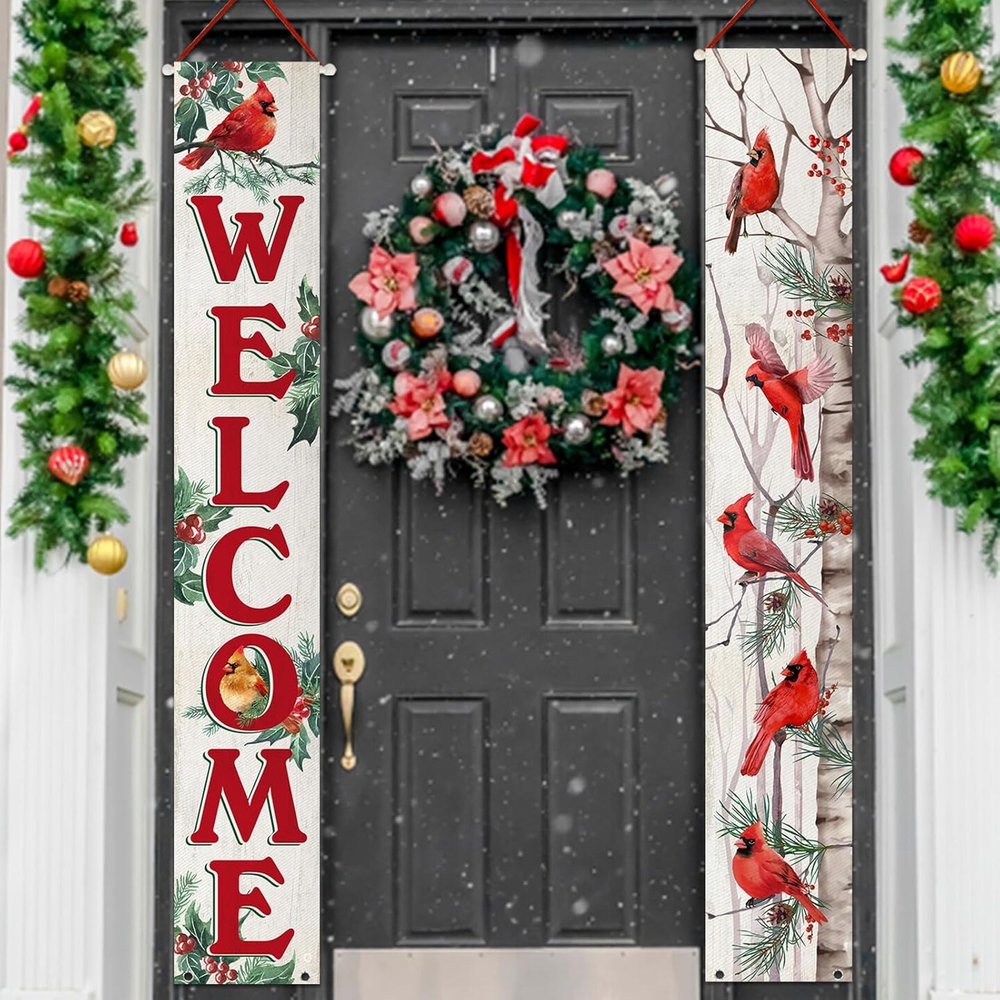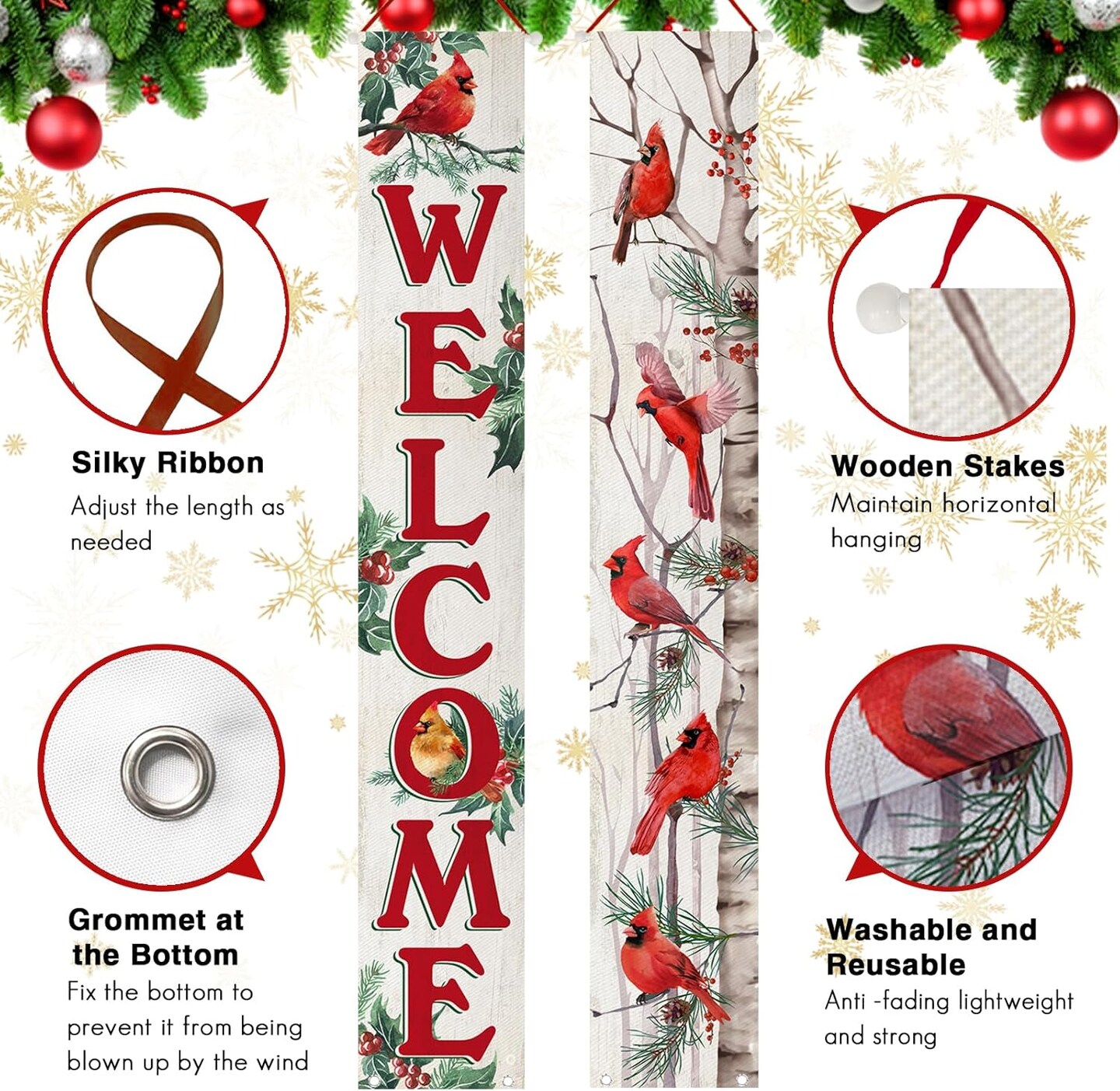 Welcome Christmas Cardinal Porch Banner Sign, Xmas Red Birds White Birch Front Door(Cardinal Bird)72"L x 12"W