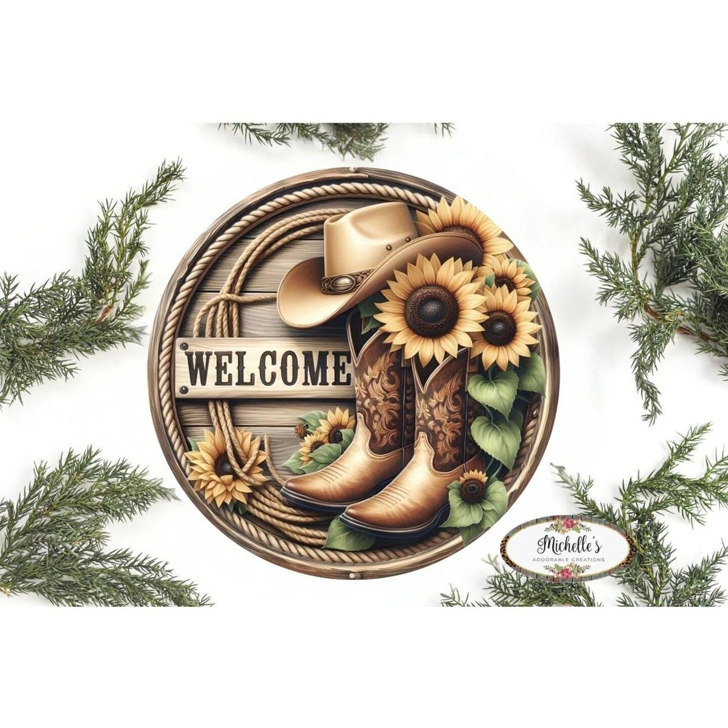 Welcome Cowboy Boots Sunflower Round Sign