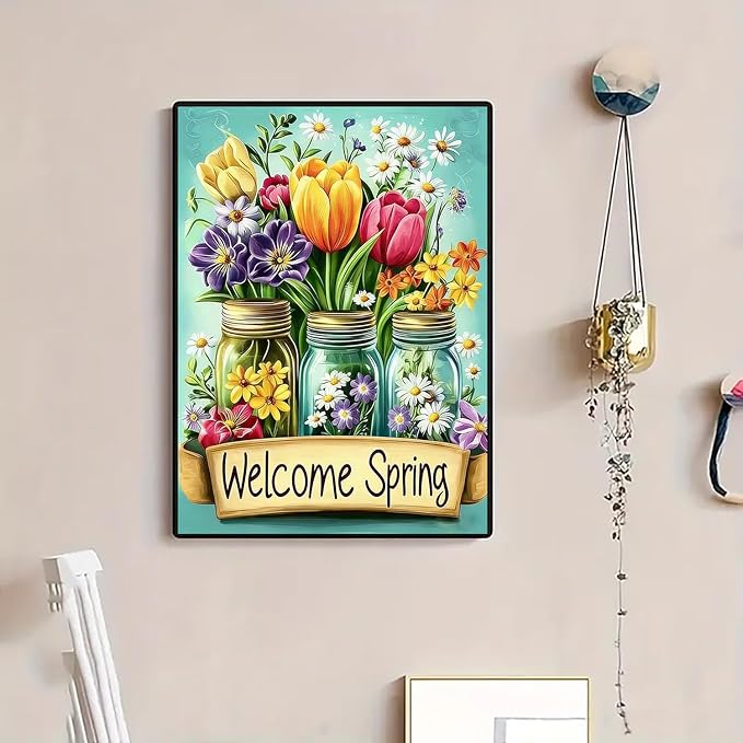Welcome Spring Flower Diamond Art Kits for Adults, 5D Diamond Painting Kits for Adults Beginners, DIY Full Round Drill Diamond Dot Painting Gem Art Kits for Adult, Home Wall Decor 11.8x15.7 Inch