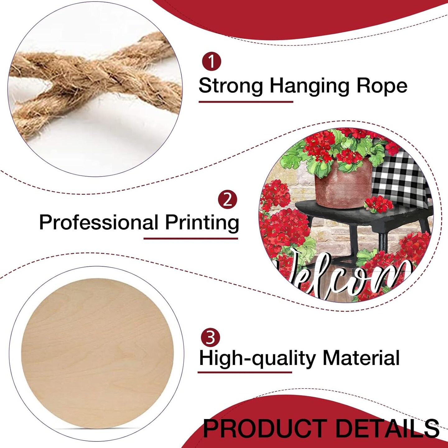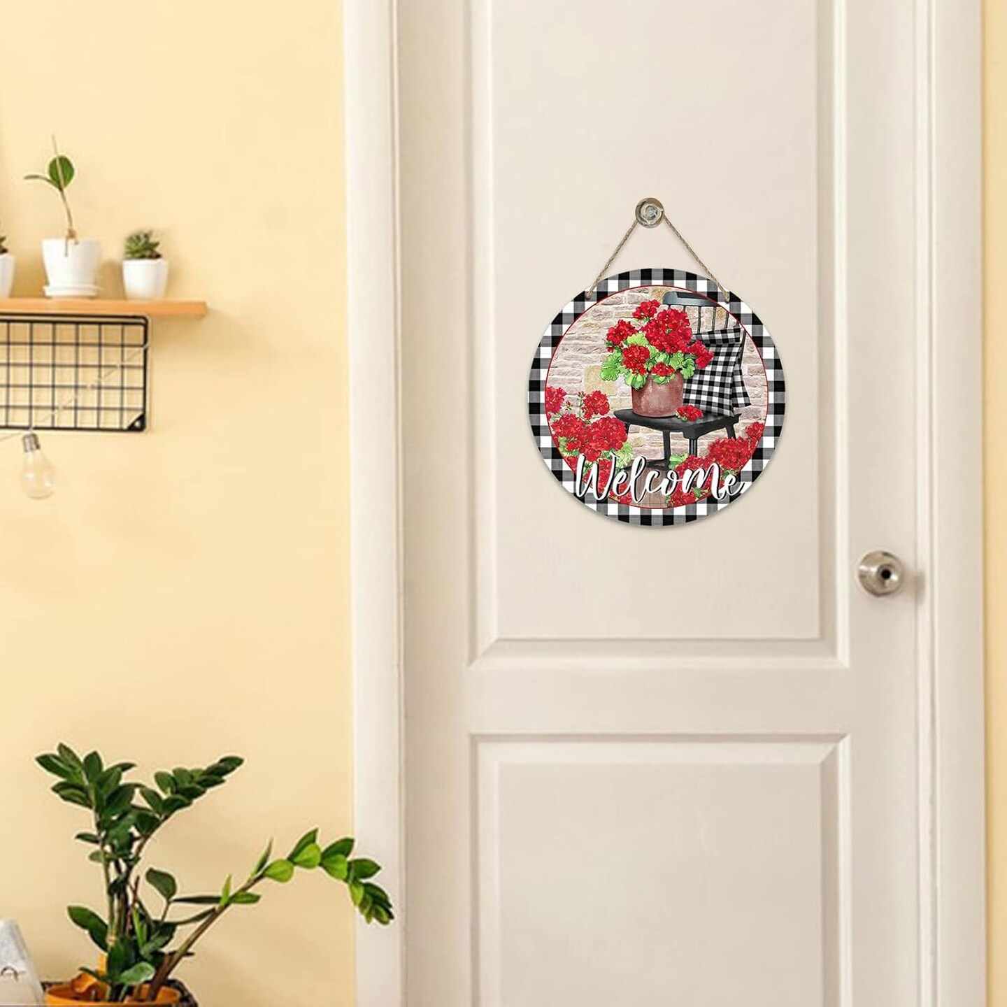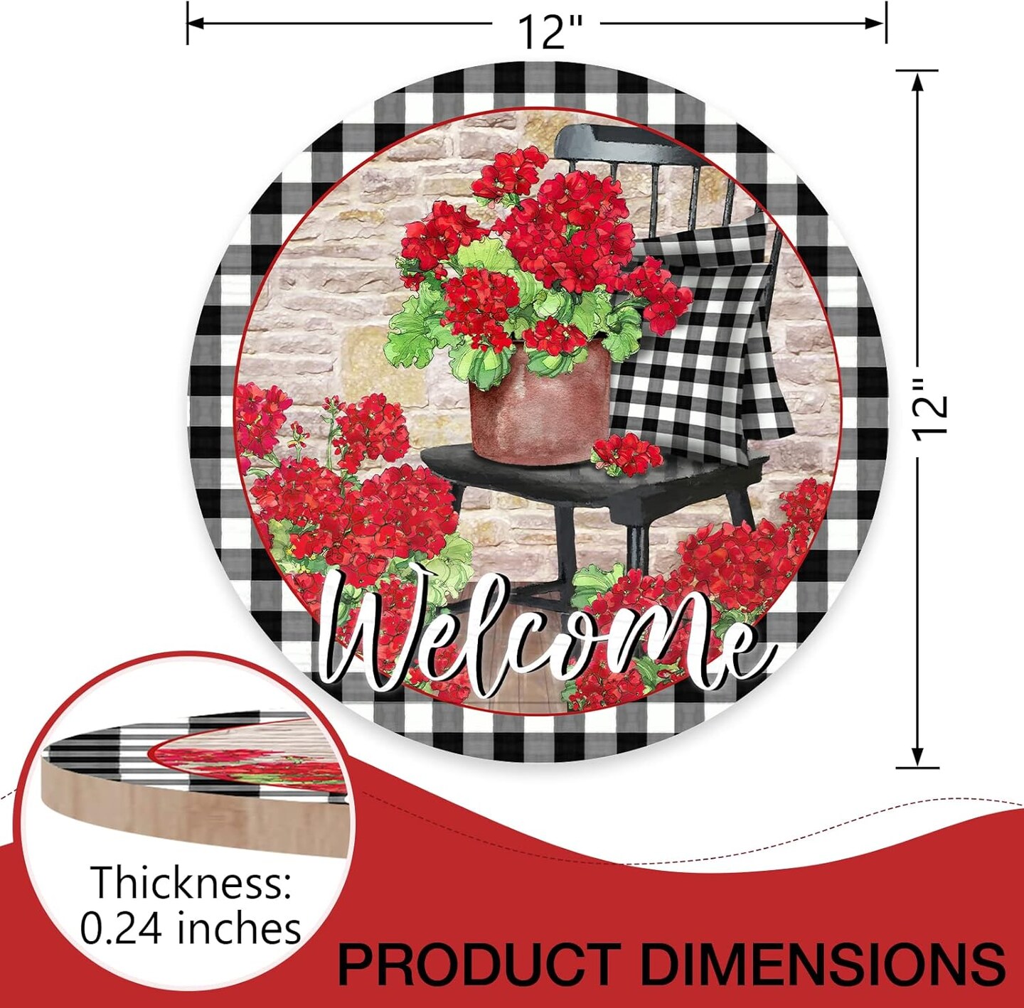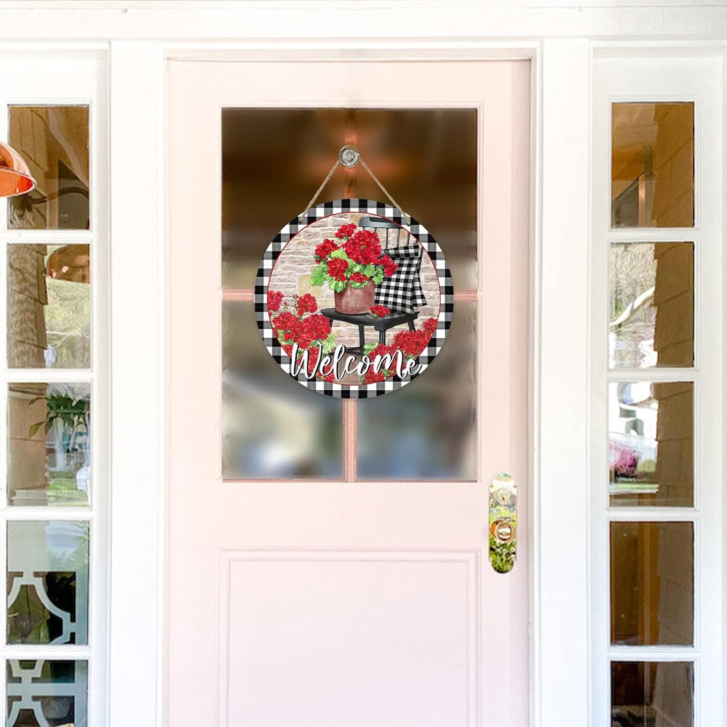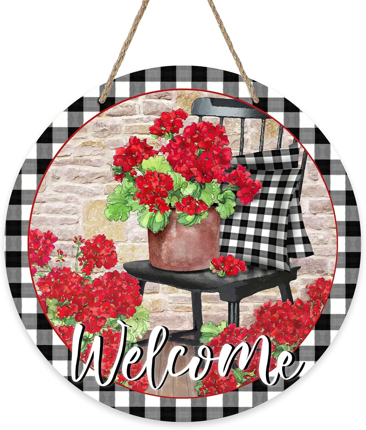 Welcome Spring Geranium Flower Sign for Front Door Decor, Floral Buffalo Plaid Chair Wood Door Hanger for Outdoor Outside Porch, Summer Farmhouse Wooden Wreath Indoor Wall Hanging Decoration