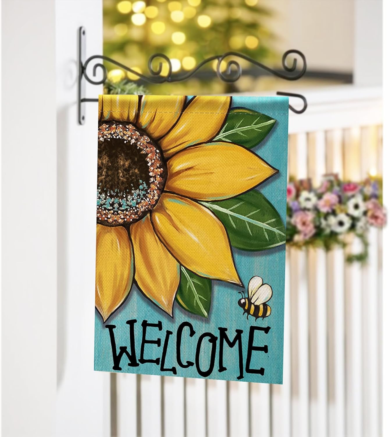 Welcome Spring Summer Sunflower Decorative Garden Flag, Floral Bumble Bee Blue Yard Outside Decorations