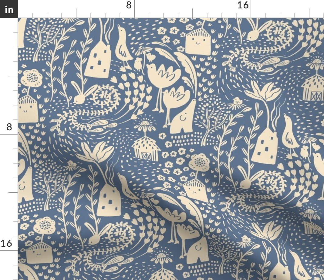 Whimsical Folk Art Blue Cream Bird Floral Shabby Chic Large Scale Custom Printed Fabric by Spoonflower Various Fabrics by the Yard or Fat Quarter