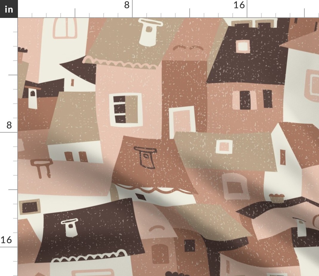 Whimsical Houses Rooftops Abstract Village Monochromatic Town Achitectural Earth Tone Cute Large Scale Custom Printed Fabric by Spoonflower Various Fabrics by the Yard or Fat Quarter