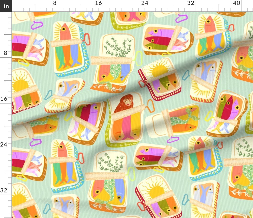 Whimsical Mermaid Tail Fish Tinned Novelty Colorful Quirky Mermaids Under The Sea Ocean Sardines Pink Green Red Orange Sun Yellow Sunshine Custom Printed Fabric by Spoonflower Various Fabrics by the Yard or Fat Quarter