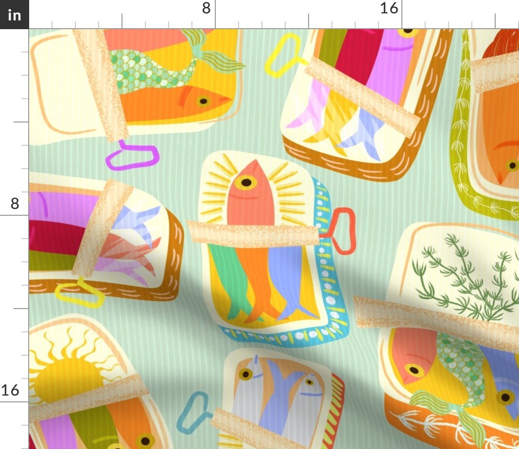 Whimsical Mermaid Tail Fish Tinned Novelty Colorful Quirky Mermaids Under The Sea Ocean Sardines Pink Green Red Orange Sun Yellow Sunshine Custom Printed Fabric by Spoonflower Various Fabrics by the Yard or Fat Quarter