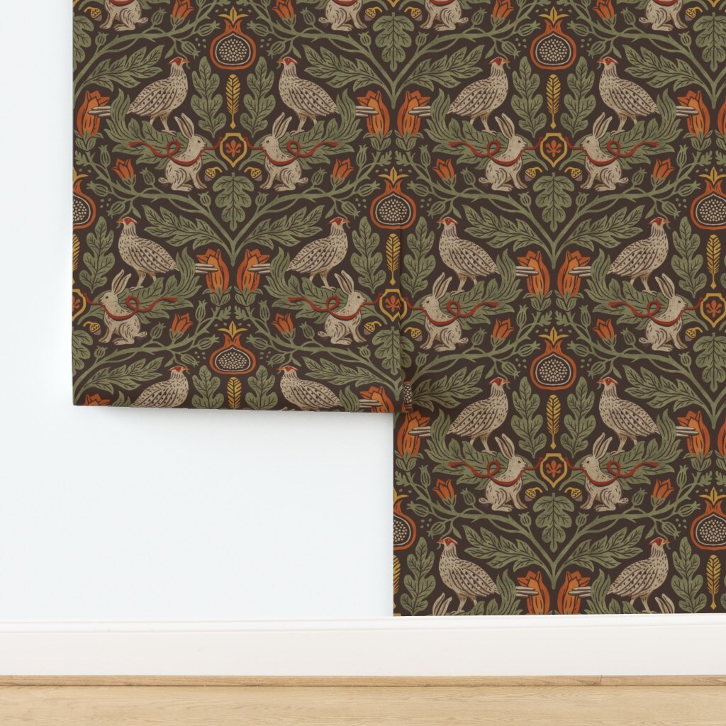 Whimsical Rustic Pheasants Rabbits Floral Botanical Oak Leaves Storybook Farmhouse Woodland Fairytale Heritage Flowers Ribbon Leaves Brown Custom Pre-pasted Wallpaper by Spoonflower Pre-Pasted Wallpaper 2FT Wide