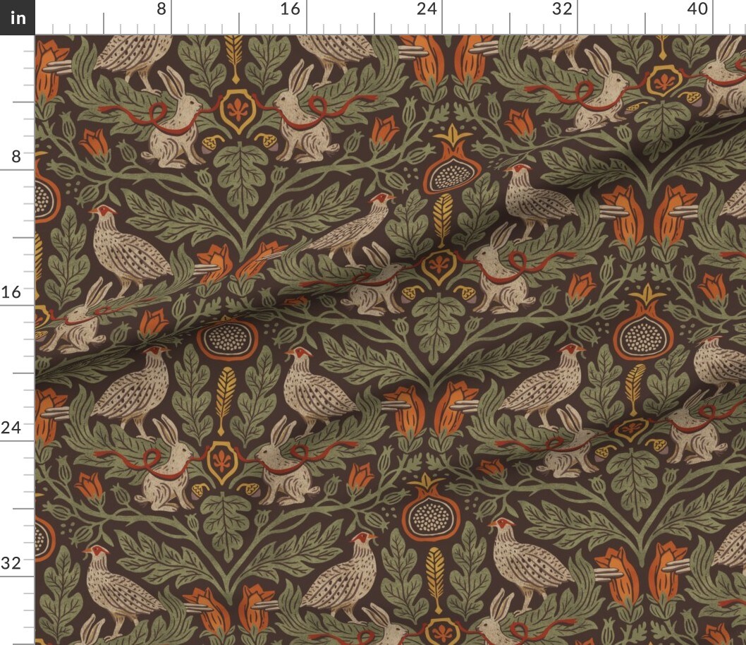 Whimsical Rustic Pheasants Rabbits Floral Botanical Oak Leaves Storybook Farmhouse Woodland Fairytale Heritage Flowers Ribbon Leaves Brown Custom Printed Fabric by Spoonflower Various Fabrics by the Yard or Fat Quarter