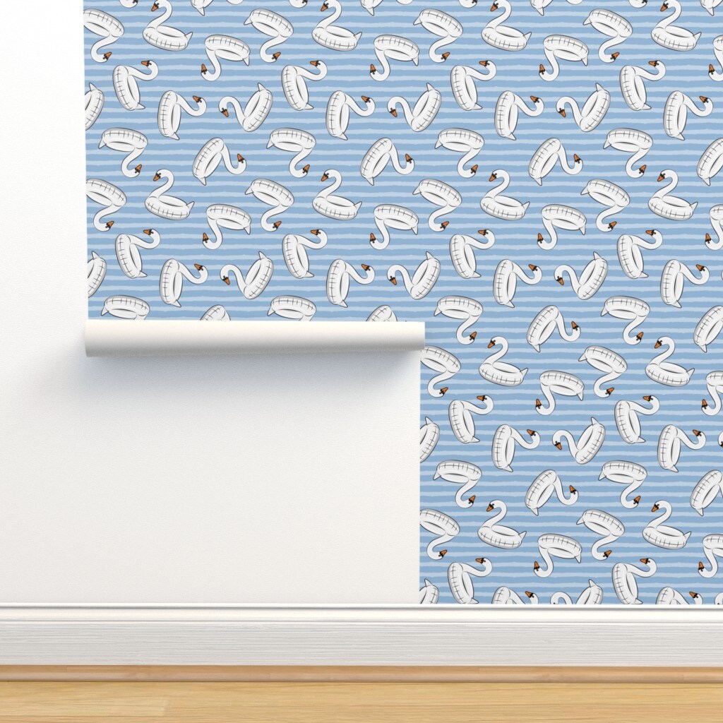 Whimsical Summer Beach Stripes Swan Pool Fun Small Scale Coastal Ocean Blue Custom Removable Wallpaper by Spoonflower Peel & Stick Wallpaper 2FT Wide