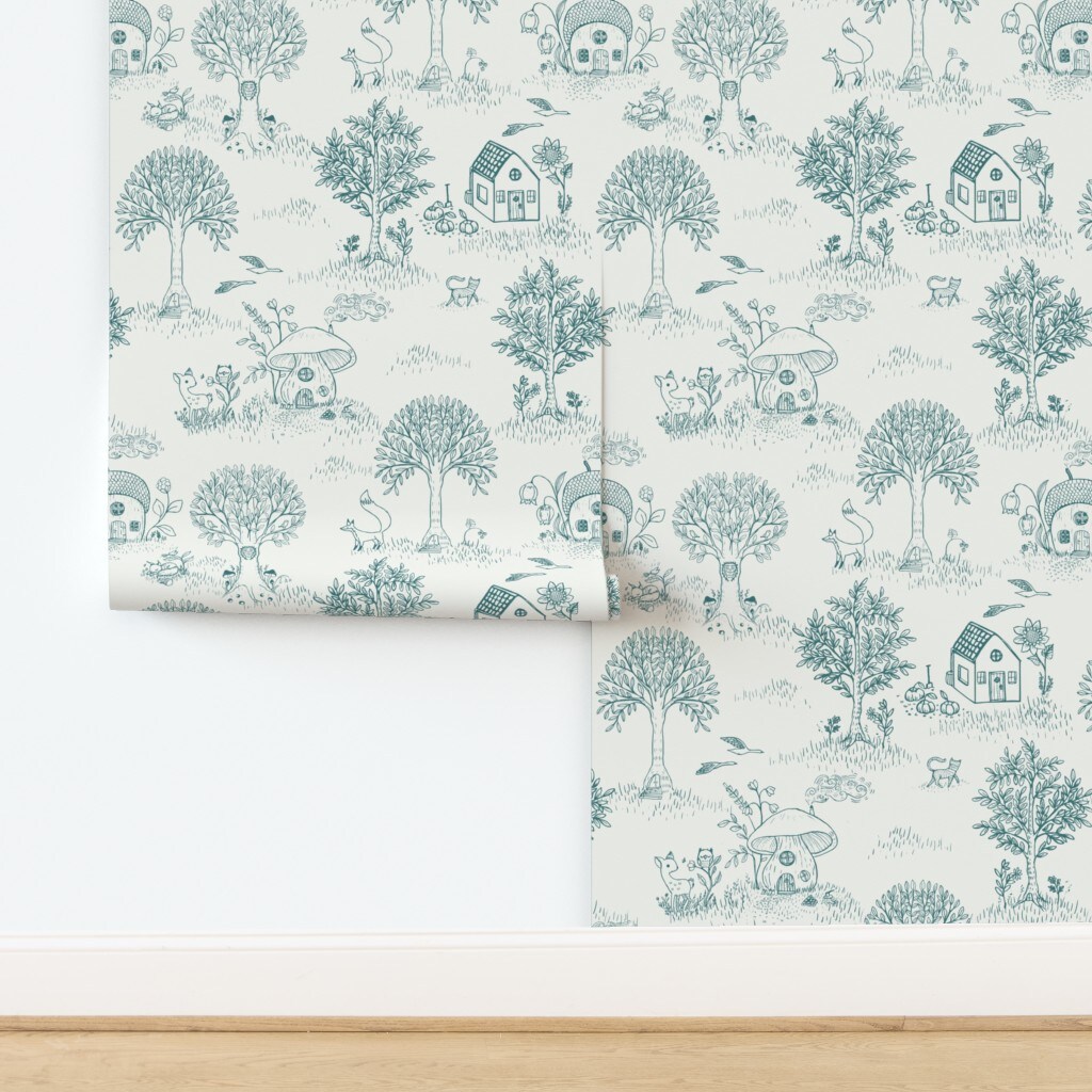 Whimsical Traditional Toile Animals Forest Woodland Trees Fairy House Deer Mushroom Cottagecore Fox Cat Birds Vintage Flowers Playroom Nursery Custom Removable Wallpaper by Spoonflower Peel & Stick Wallpaper 2FT Wide