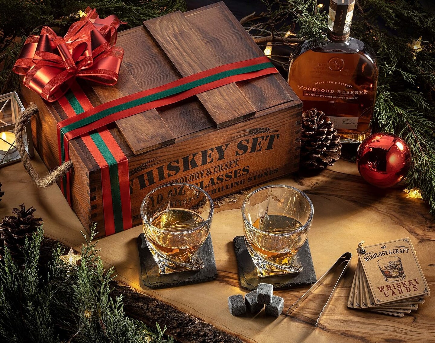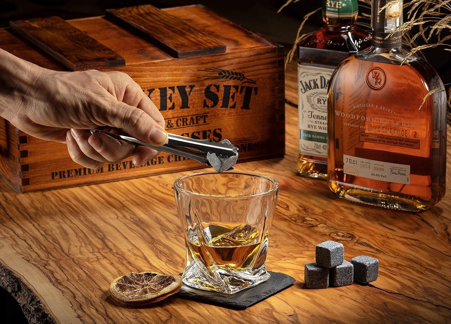 Whiskey Gift Set, Whiskey Glass Set with Rustic Wooden Crate, 8 Granite Whiskey Rocks Chilling Stones, 10oz Whiskey Glasses, Gift for Men, Dad, Husband, Boyfriend - Jameson Brown