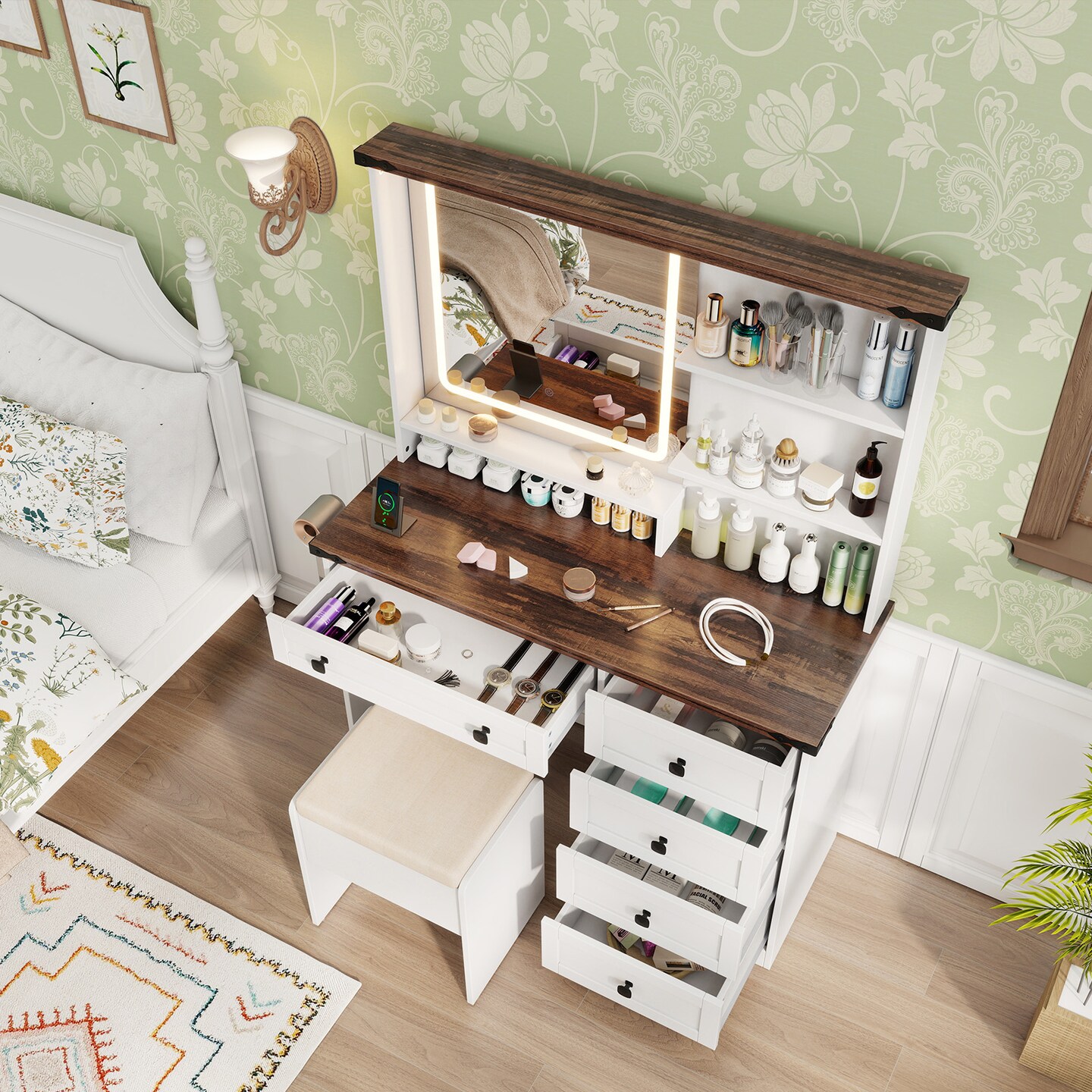White and Dark Brown Makeup Vanity Table with 3-Color LED Mirror Storage Drawers and Stool