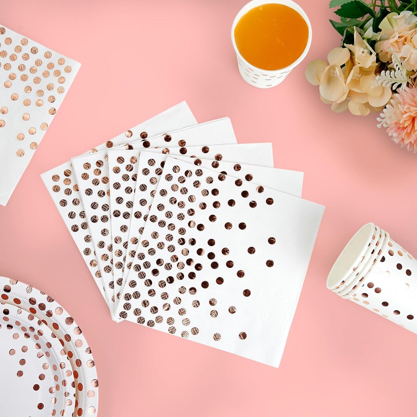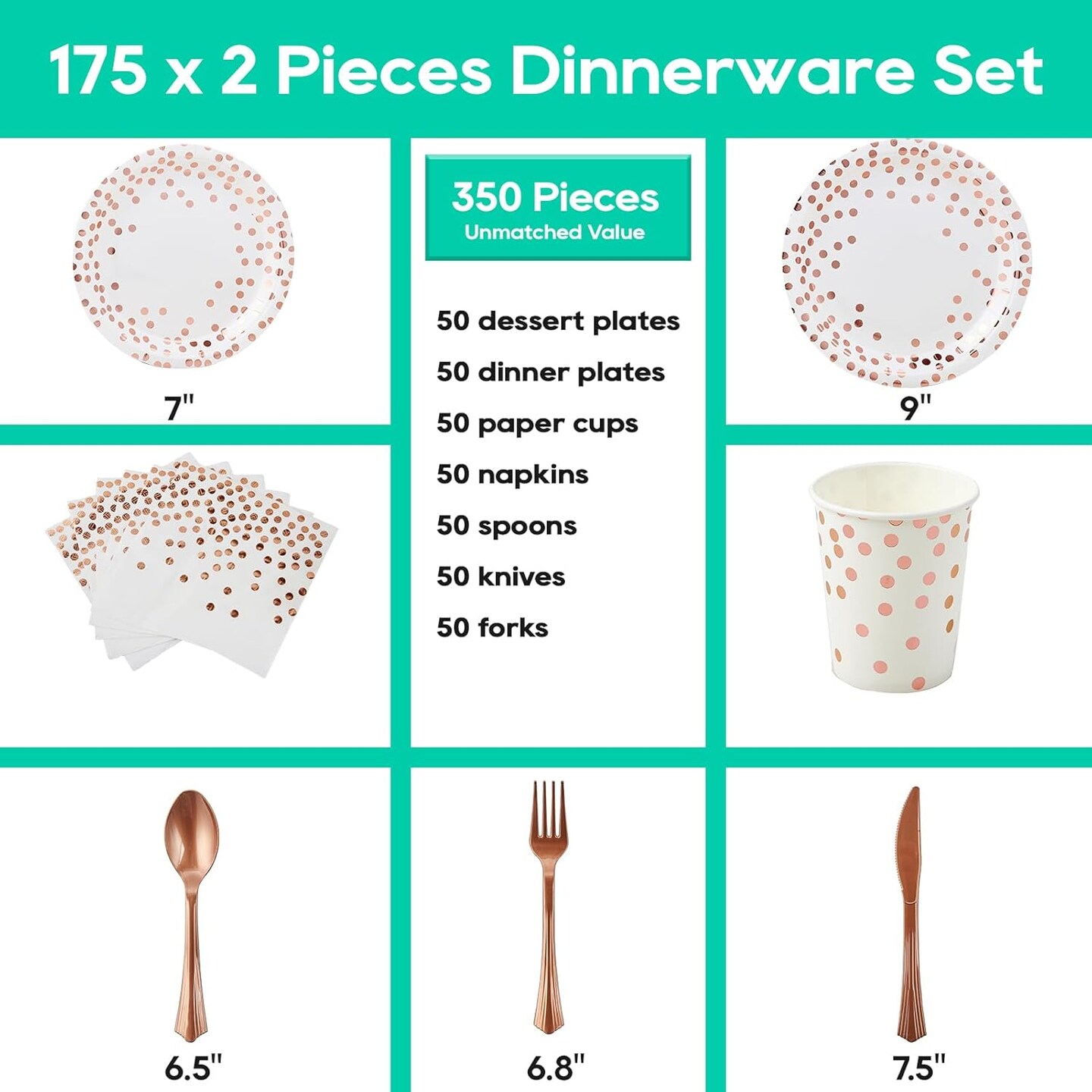 White and rose gold party supplies set, 350 pieces total, including white paper plates, napkins, cups, and gold plastic forks, knives, and spoons. Perfect for graduations, birthdays, cocktail parties, or any special event, offering a chic and elegant