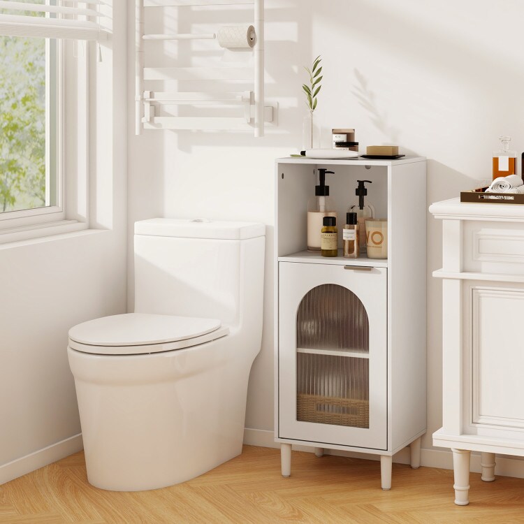 White Bathroom Storage Cabinet with Tempered Glass Door and Adjustable Shelves, Solid Wood Legs
