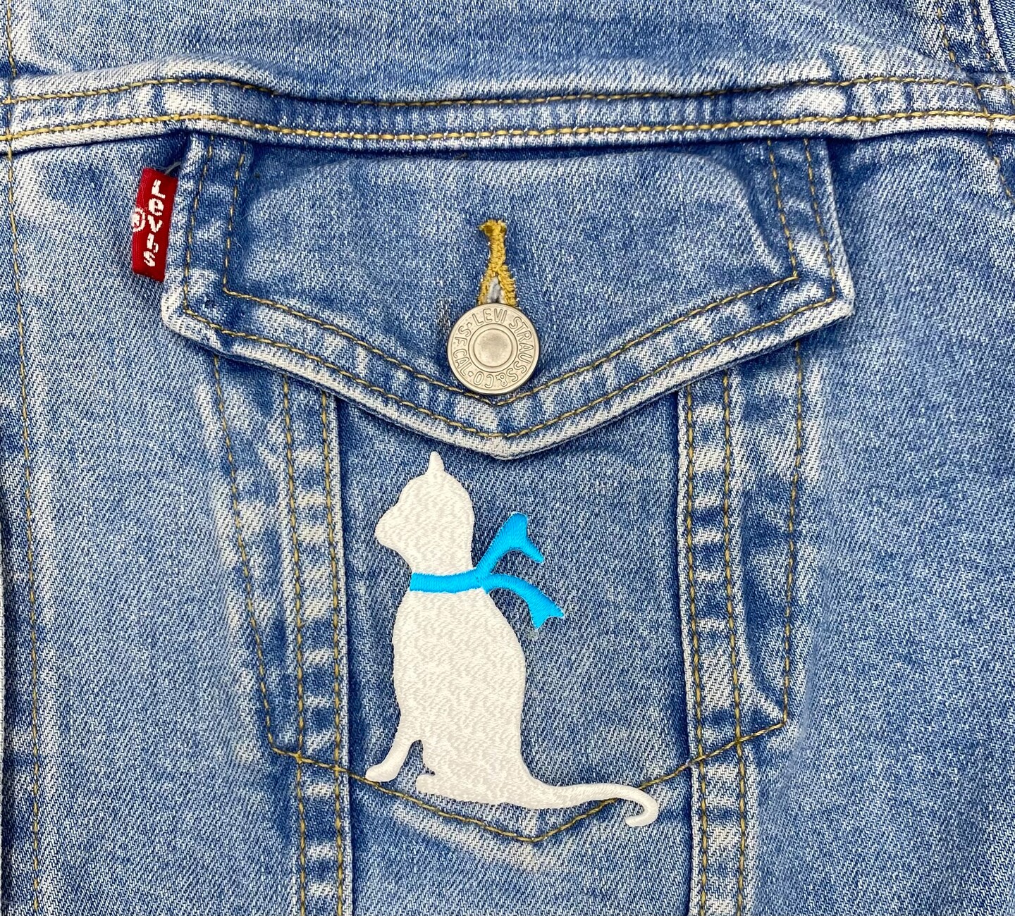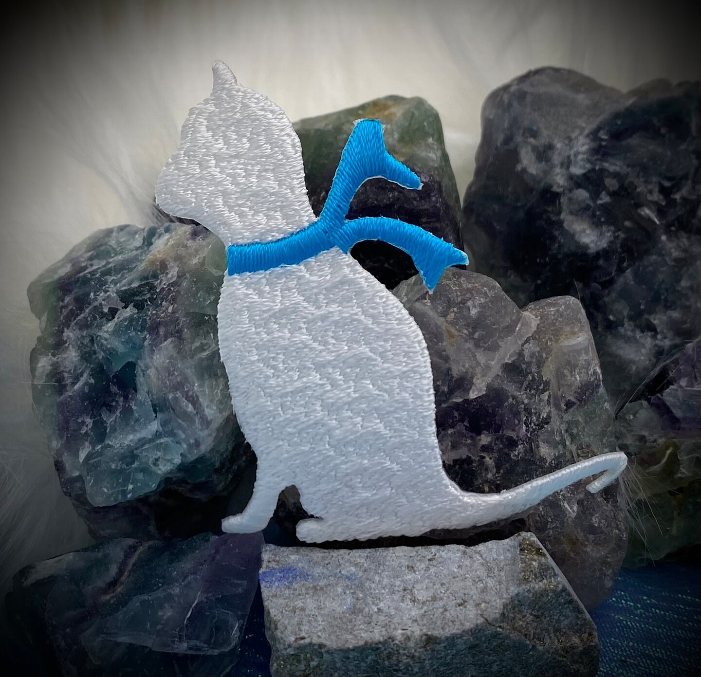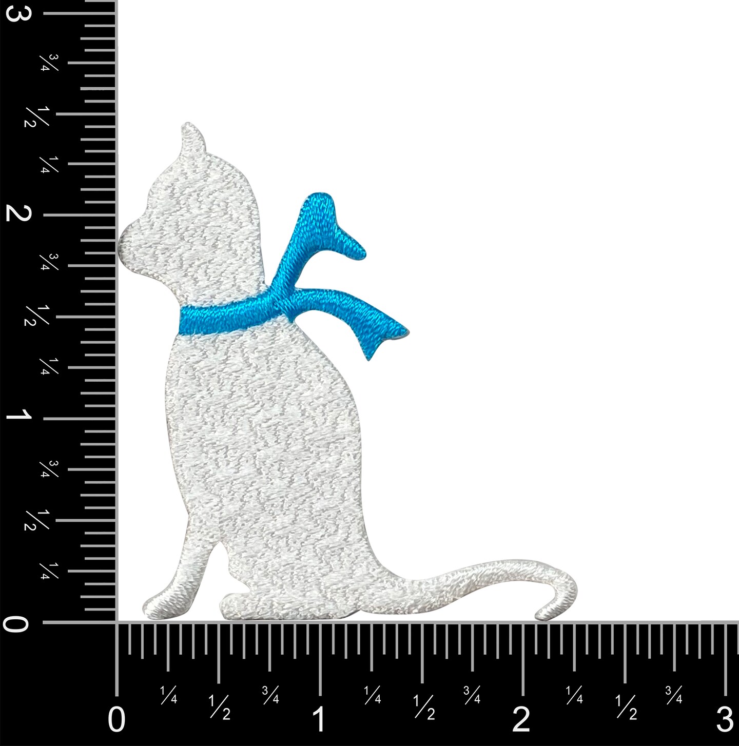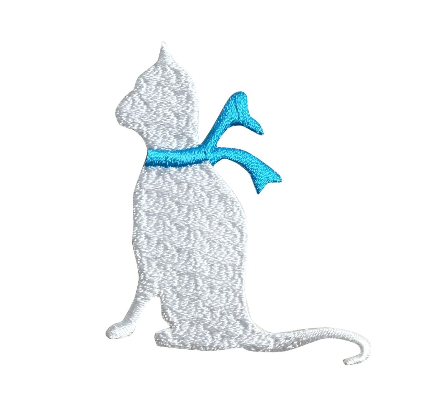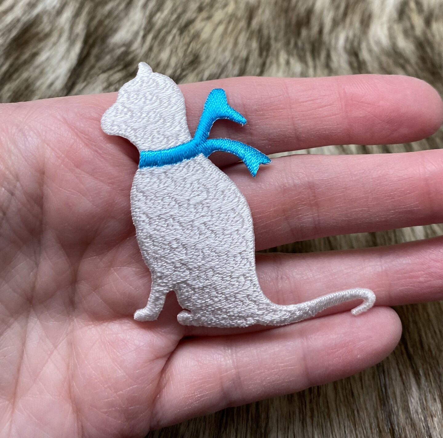 White Cat, Silhouette, Blue Ribbon, Kitten, Pets, Embroidered, Iron on Patch