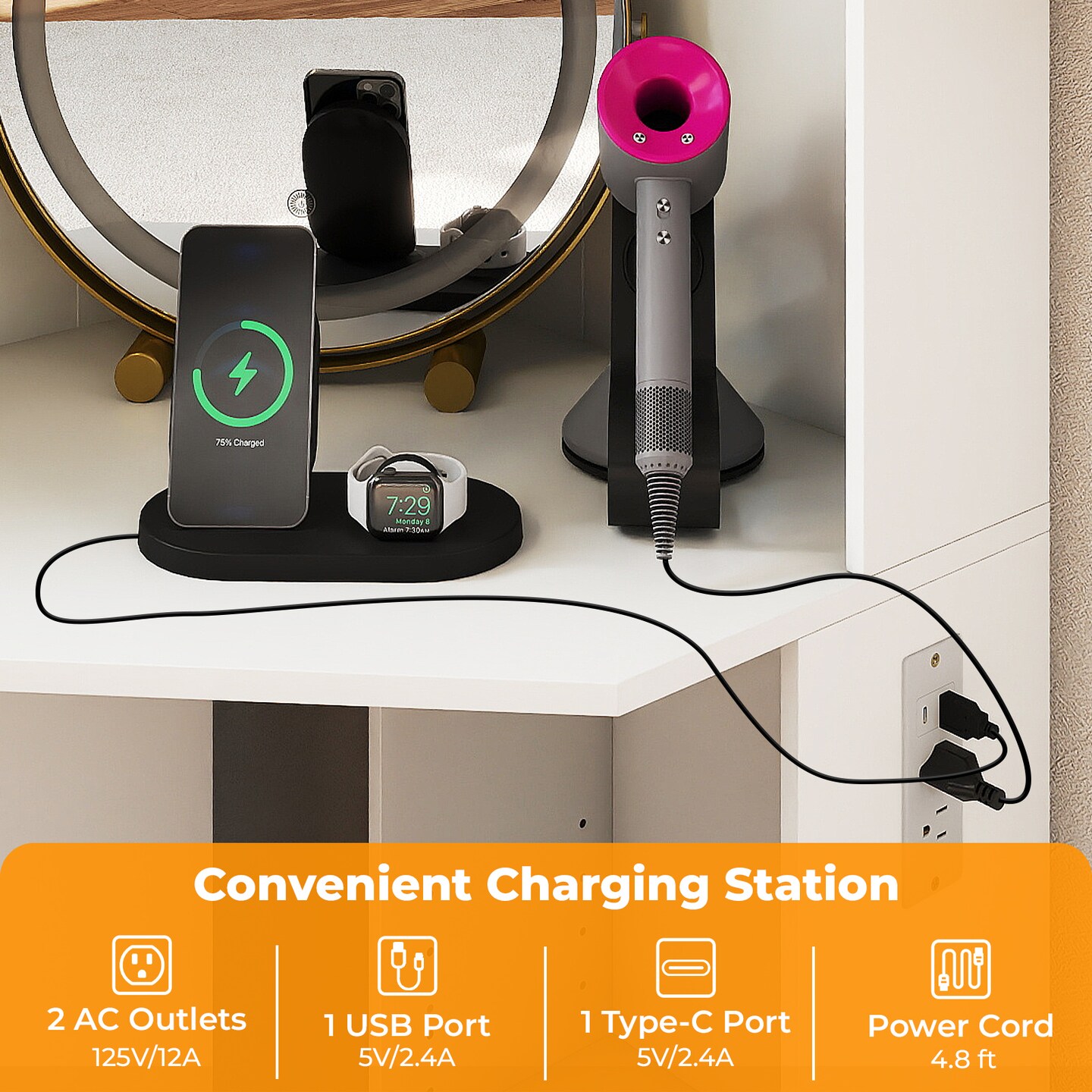 White Corner Vanity Table with Rotating Mirror LED Lights Storage Stool