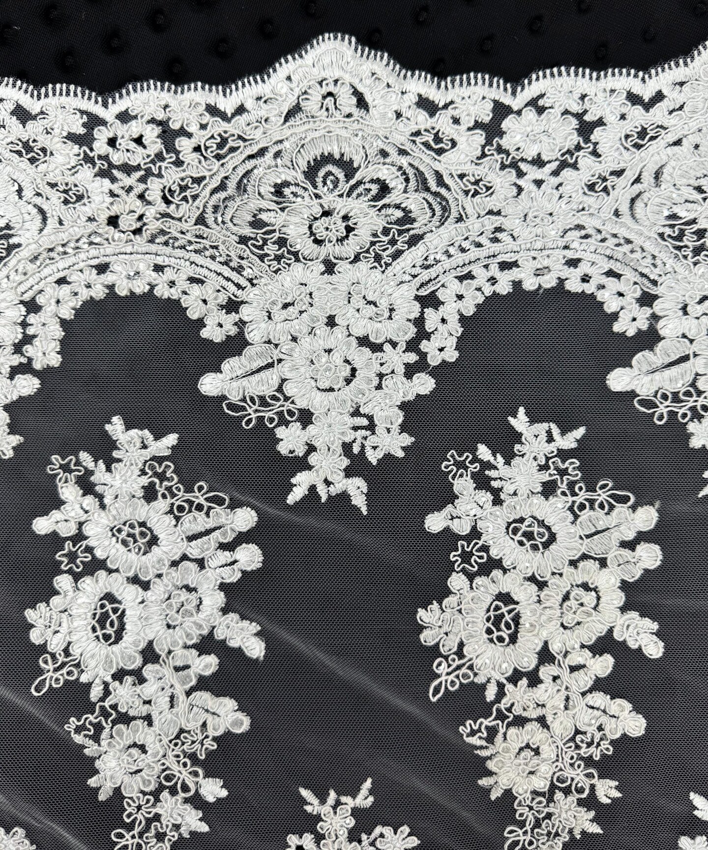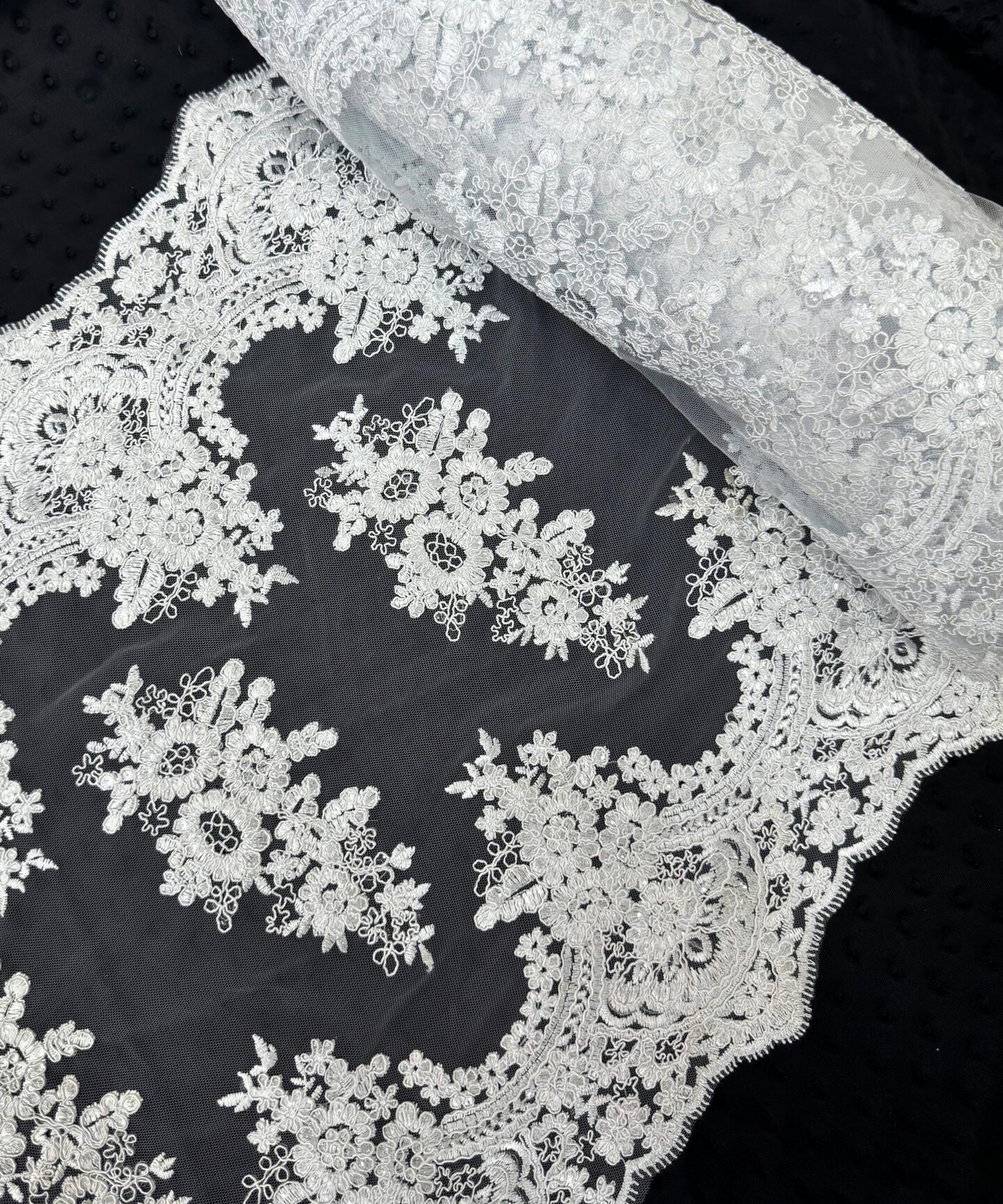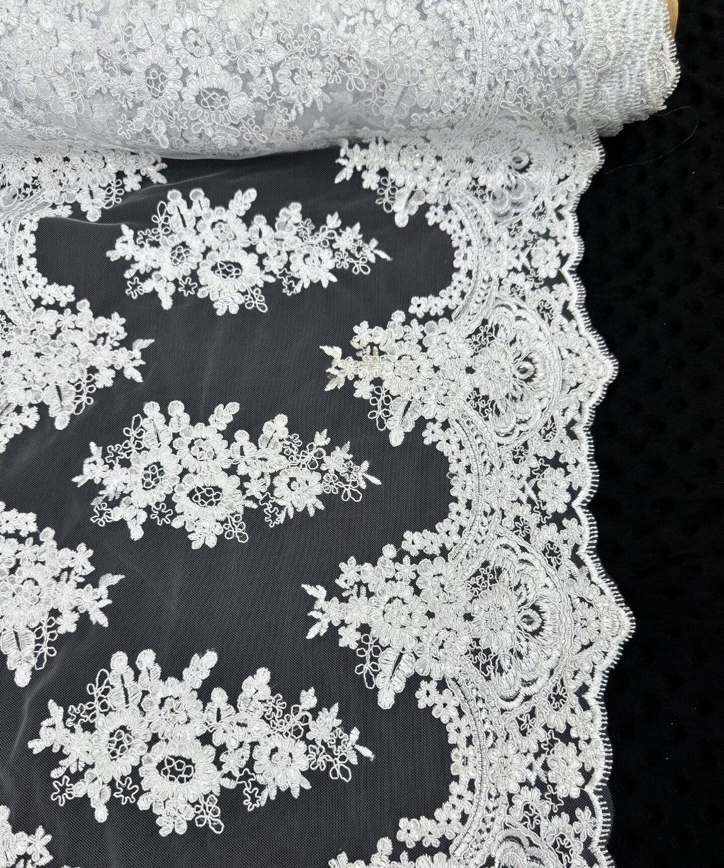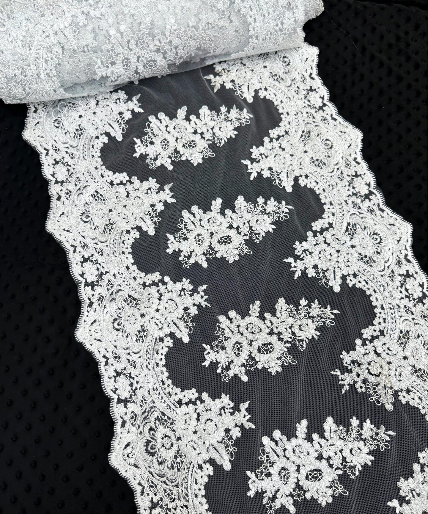 White Embroidered Lace Table Runner by the Yard, 20" Wide Sequin Mesh Lace Trim with Scalloped Edges