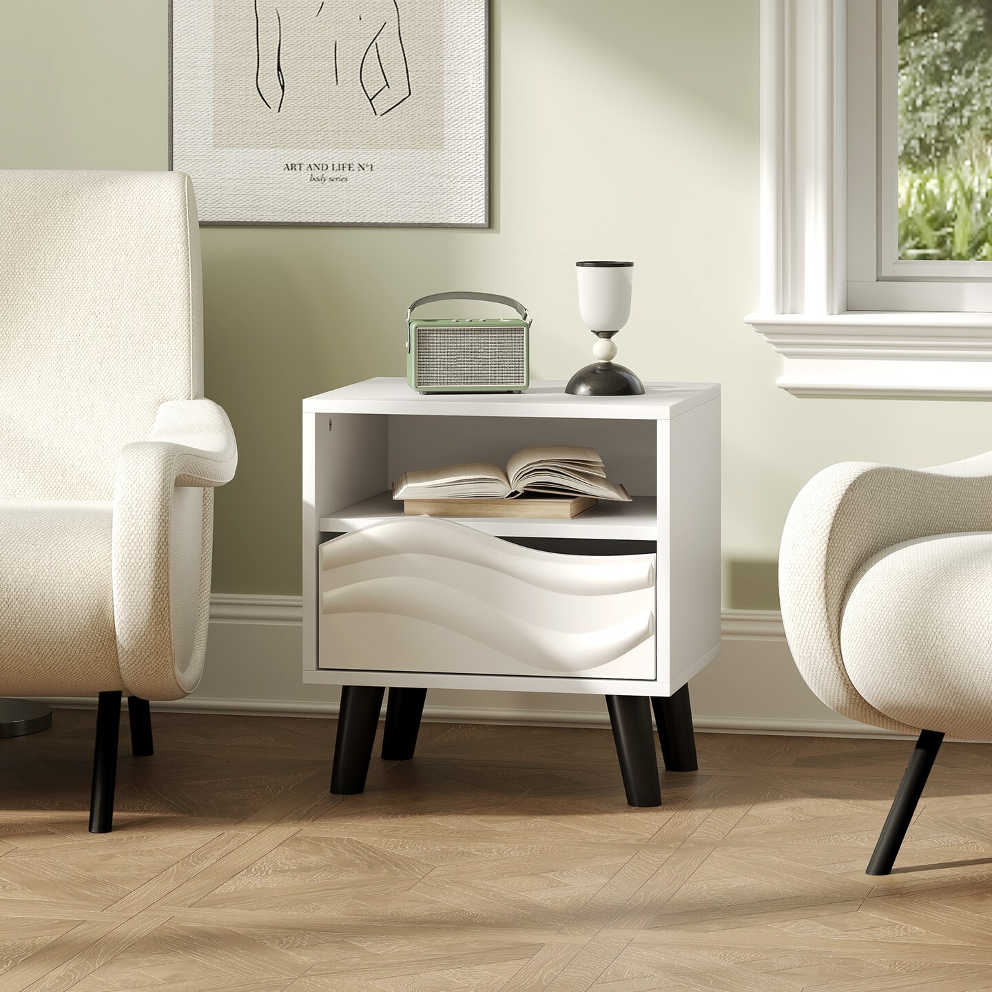 White Engineered Wood Nightstand with 3D Wavy Drawer, Open Shelf and Tapered Legs