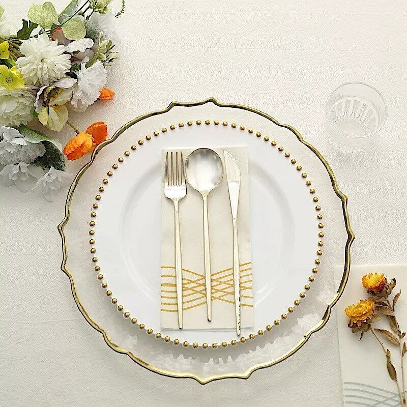 WHITE GOLD 10 Round 10" Plastic Salad PLATES Beaded Rim Party Events Decorations
