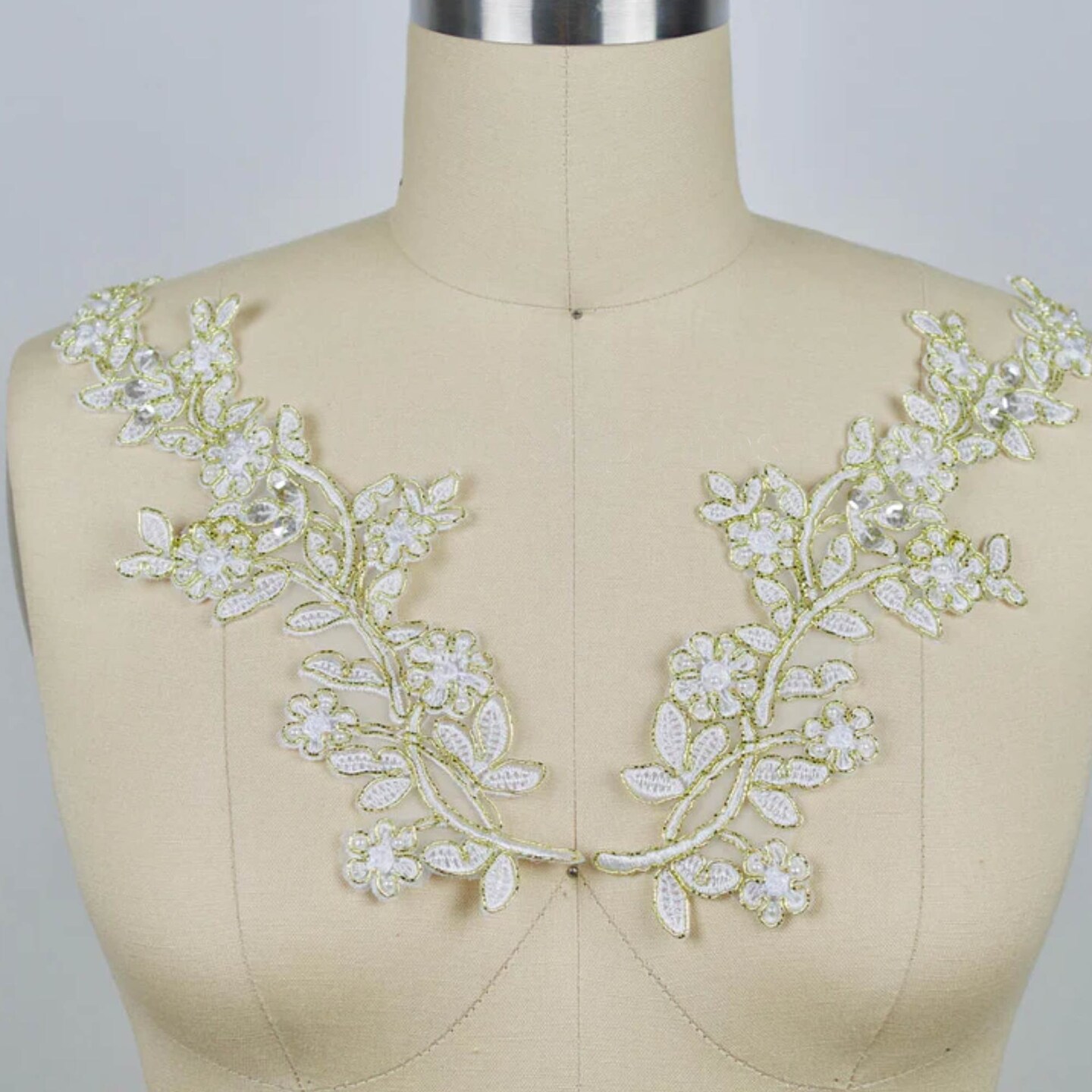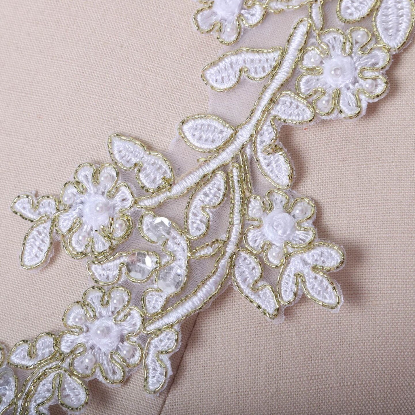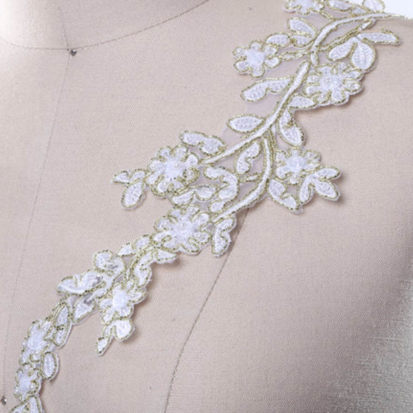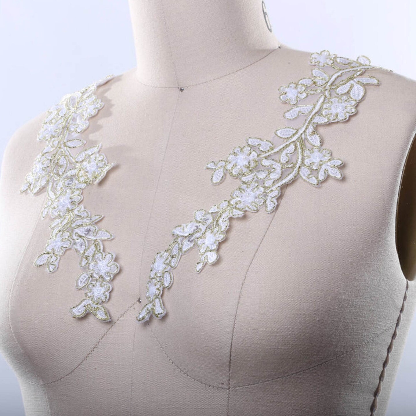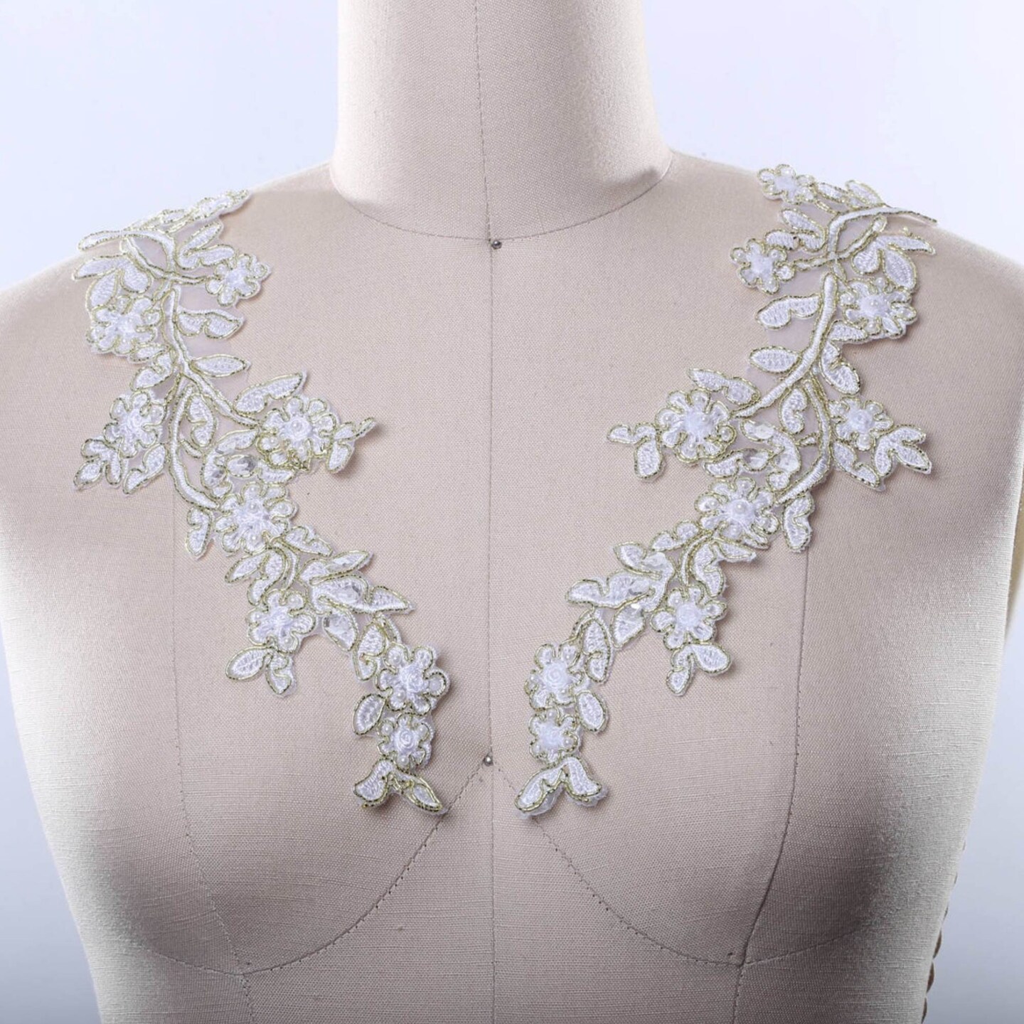 White Gold Beaded Sequined Lace Applique Pair Alencon Pearl