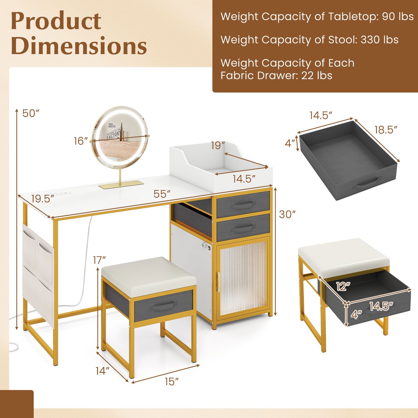 White Gold Grey Vanity Table LED Rotating Mirror Charging Station Fabric Drawers