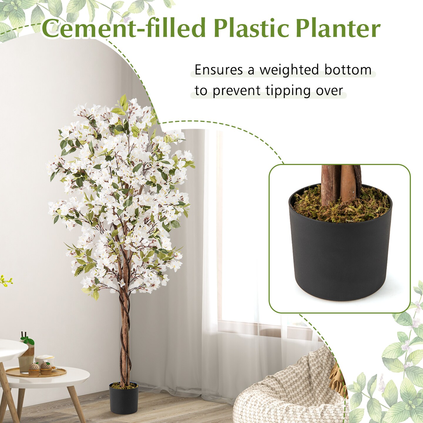 White Green Artificial Bougainvillea Tree with Cement Base, 6 ft