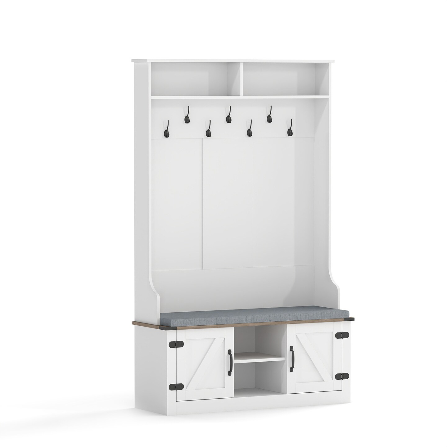 White Hall Tree with Shoe Bench Cushioned Seat Coat Rack Storage Cabinet