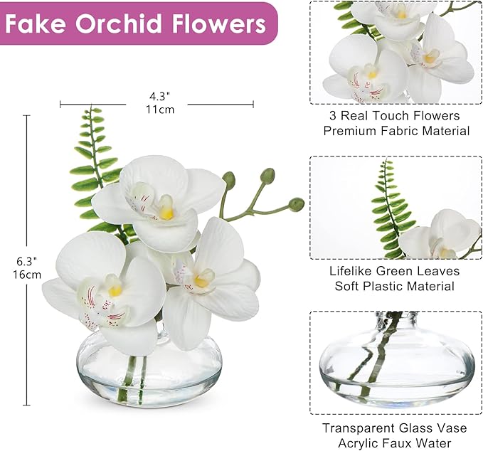 White Orchids Artificial Flowers Faux Orchids Arrangement in Clear Glass Vases Set of 3 Real Touch Phalaenopsis Orchid Flowers Small Fake Orchid Centerpiece for Dining Room Table