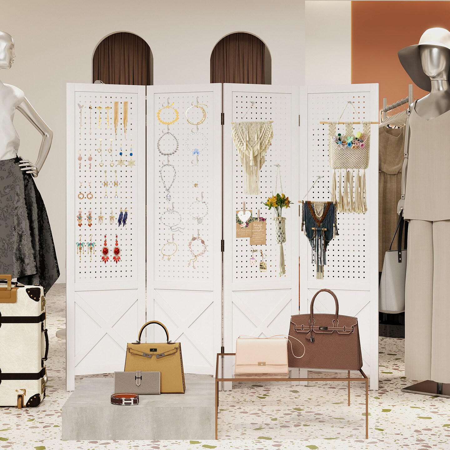 White Paulownia Wood Pegboard Room Divider 4-Panel Folding Display Stand