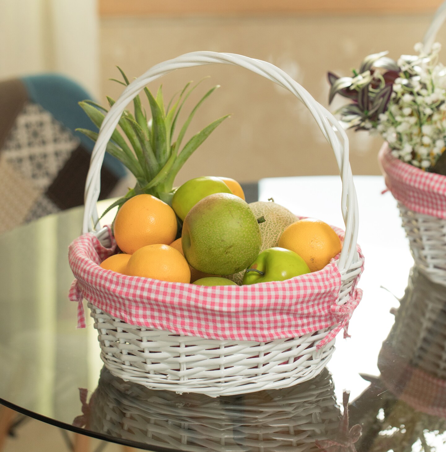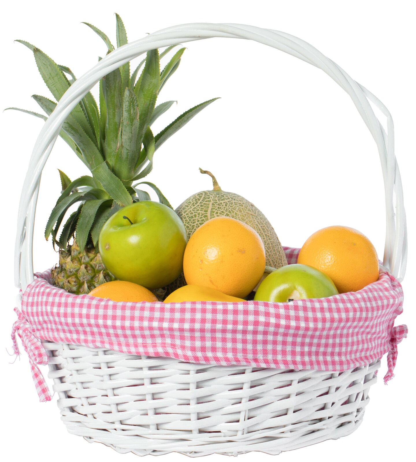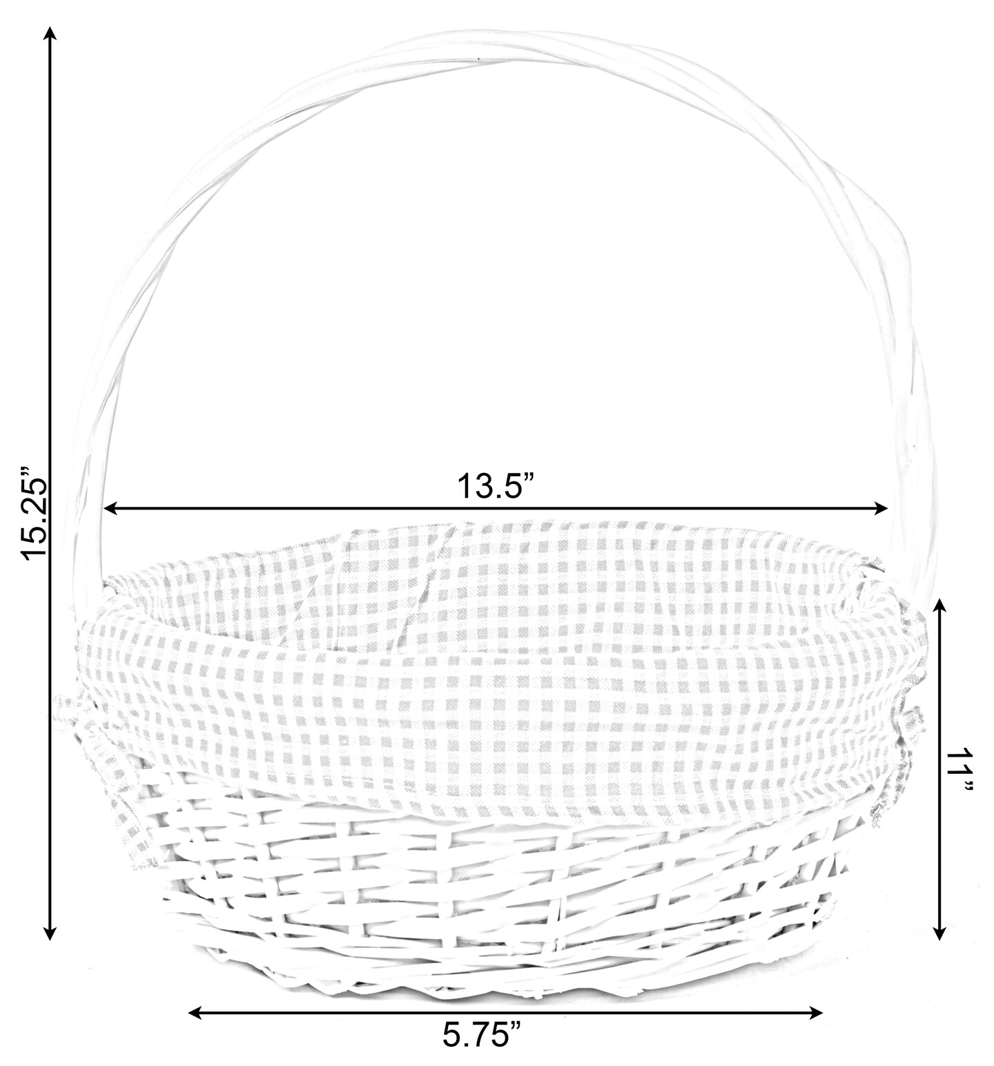 White Round Willow Gift Basket, with Gingham Liner and Handle