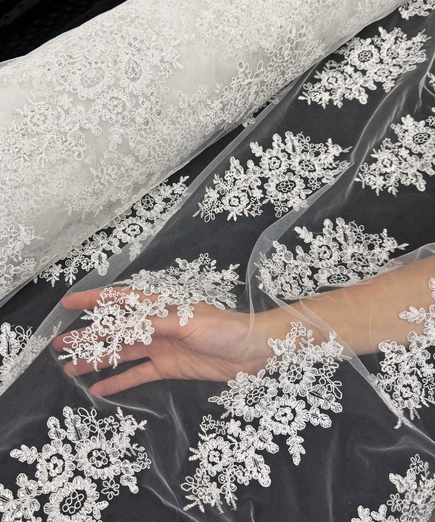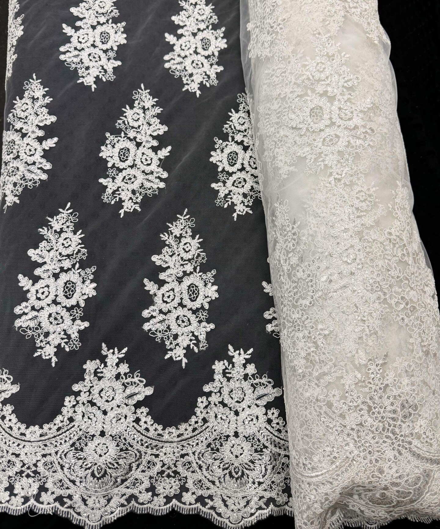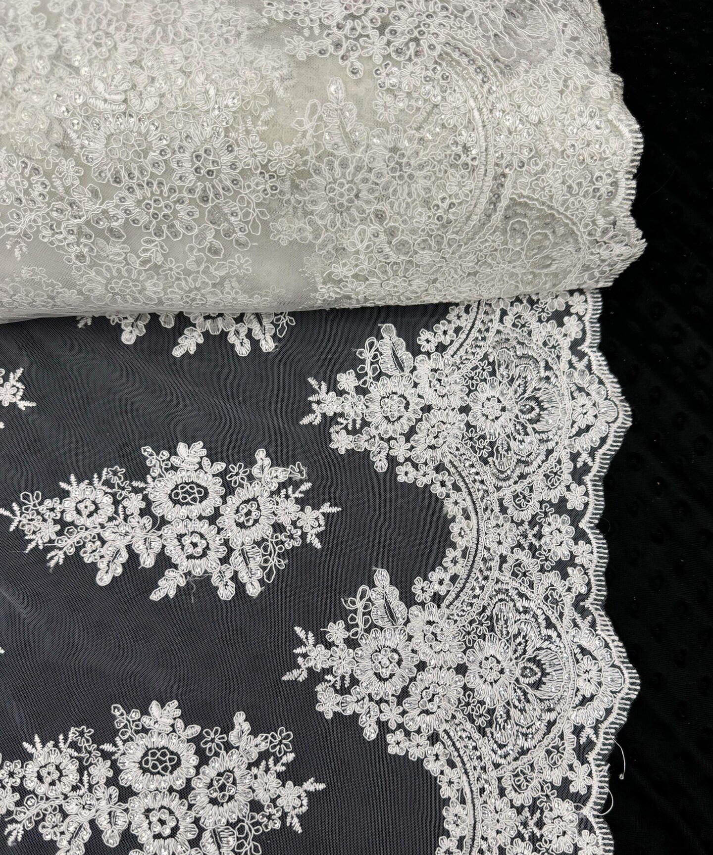 White Sequin Embroidered Lace Fabric by the Yard, 54" Wide Floral Mesh Lace with Double Scalloped Edges